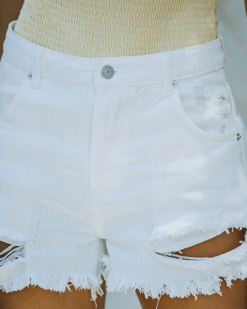 Our Stuart High Rise Distressed Denim Shorts are such a cool girl style! These white distressed denim shorts feature a high rise and a classic 5 pockets. Finished with a front zipper and button closure. Styled with the Wellness Layered Pendant Necklace, Initial Card Necklace, Simple Bangle Bracelet, Highland Bag, Honeydew Smocked Tank Bodysuit, and Twiggy Criss Cross Heeled Sandal.