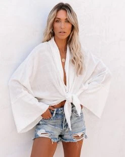 If you need an extra layer or a quick cover up, opt for the Aloha Beaches Cotton Frayed Tie Top! Designed with an open front neckline, wide cut sleeves and a lightweight feel that boasts a front tie hem. The gauzy cotton base features a white hue and finishes with frayed edges! Pair yours over layered necklaces and a bralette. Styled with the Model Layered Hoops, Knox Necklace, Mosaic Coin Necklace, Summa Time Relaxed Cut Off Denim Shorts and the Brianne Twisted Faux Leather Sandal.