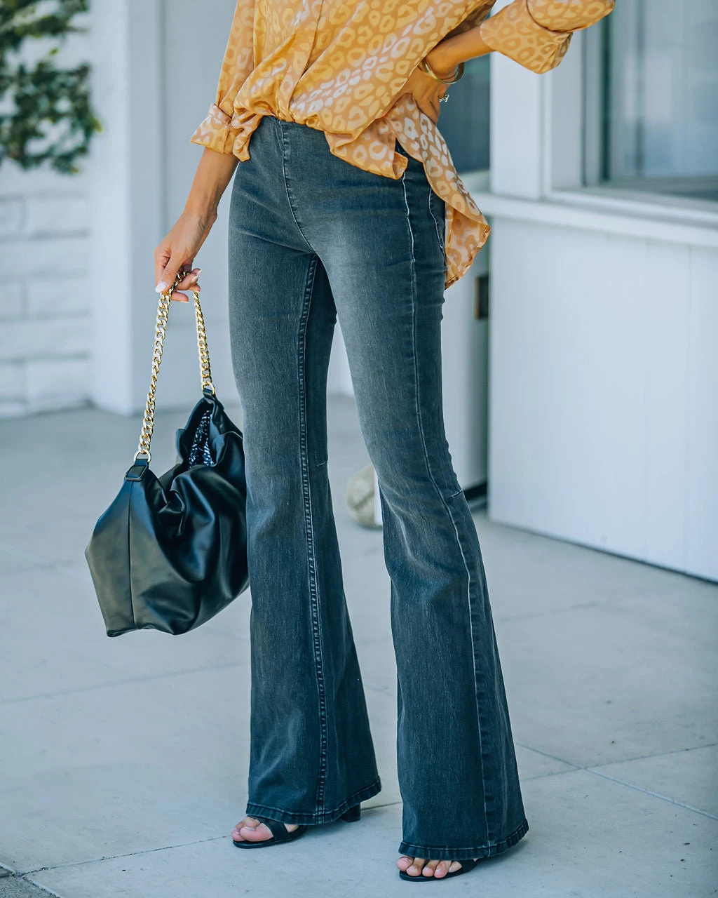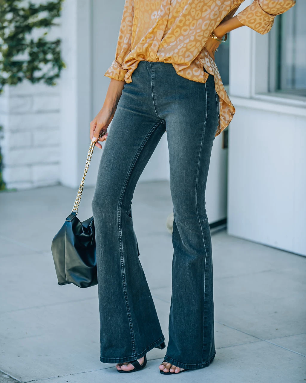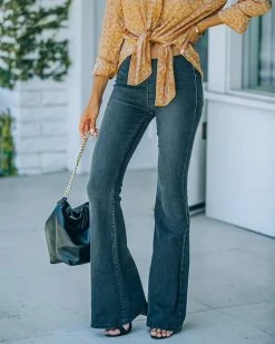 //Best Seller// Retro vibes are alive and well in our Stevie Bell Bottom Denim Pants! Fitting with a mid-rise elastic waistband, a black wash and flared bell leg. Constructed to fit snuggly with a lot of stretchy for the utmost comfort and snap back after multiple wears! Subtle thigh fading and two back pockets finish off the look. Styled with the Chloe Mini Necklace, Initial Card Necklace, Simple Bangle Bracelet, Elegance Slouchy Chain Handbag, Stevie Bell Bottom Denim Pants, and Whimsy Heel.
