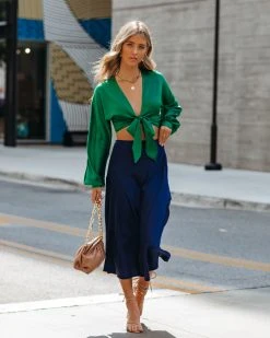 //VICI Exclusive// Your perfect friday night top, all tied up! Our Brenda Satin Tie Front Crop Blouse comes in green. Designed with a plunging neckline and button cuffs. Secured with a front tie closure. Styled with the Taylor Chain Earrings, 5 Disc Choker, Chloe Mini Necklace, Mica Chain Choker, Gaia Coin Necklace, Simple Bangle Bracelet, Chic Crossbody Chain Pouch Bag, Wishful Satin Slit Midi Skirt, and Bella Faux Leather Strappy Kitten Heel.