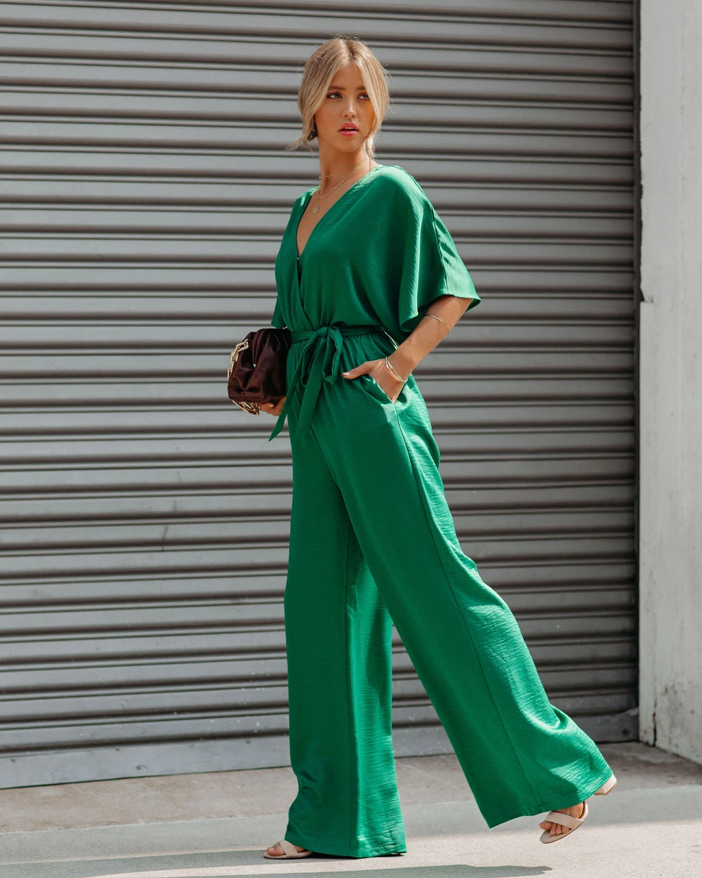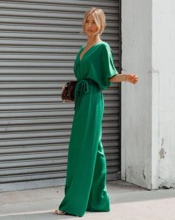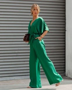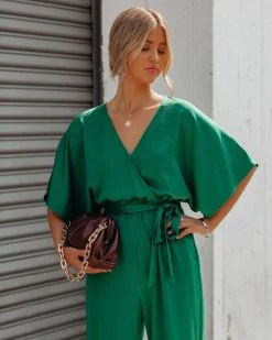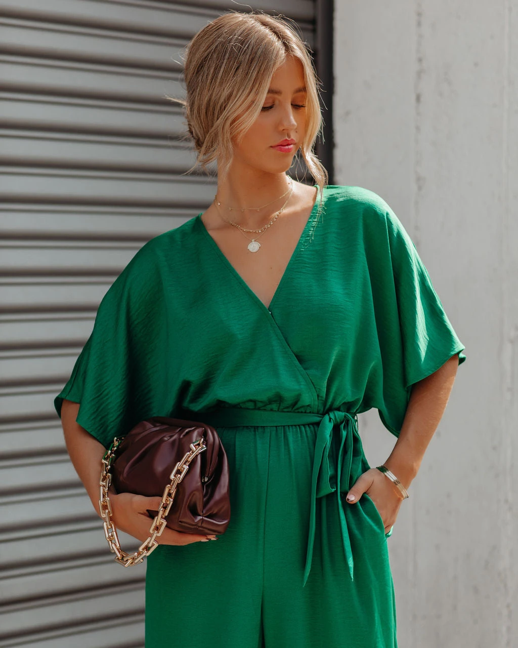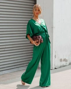 //VICI Exclusive// We canโt get enough satin this season! Our Empowered Satin Pocketed Jumpsuit comes in green. Designed with a draped neckline and side pockets. Secured with an adjustable waist tie. Styled with the Vanessa Drop Earrings, 5 Disc Choker, Chloe Mini Necklace, Gaia Coin Necklace, Simple Bangle Bracelet, Chic Crossbody Chain Pouch Bag, and Formal Faux Suede Heel.ย
