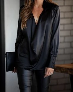 //Best Seller// Our Problem Solved Satin Collared Drape Blouse features a black satin body with a soft sheen.