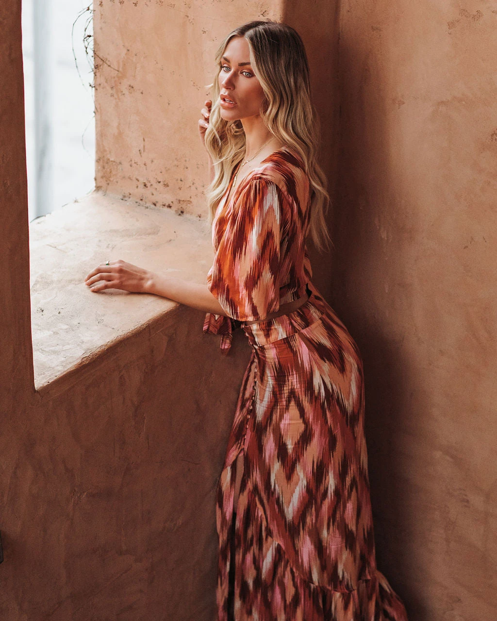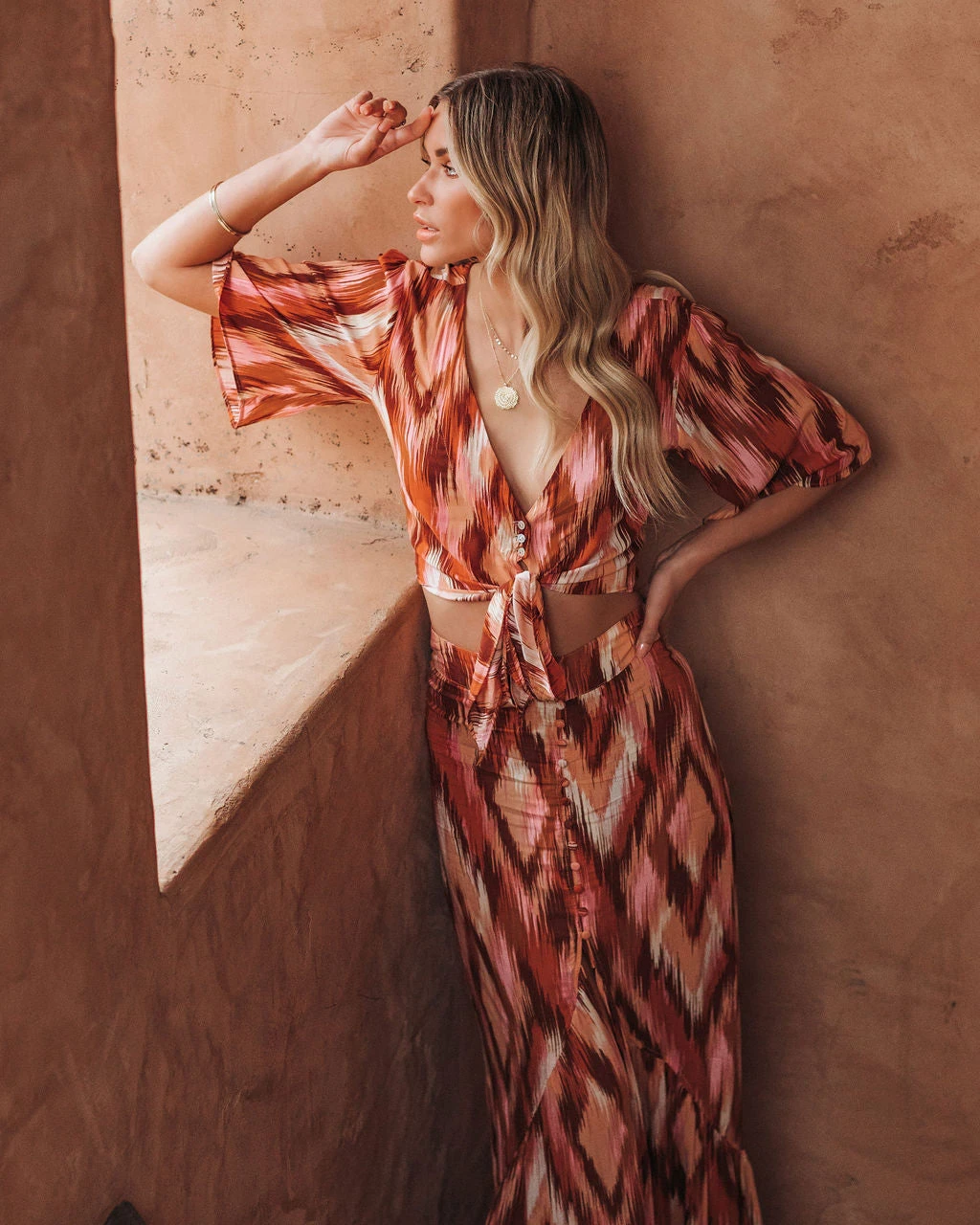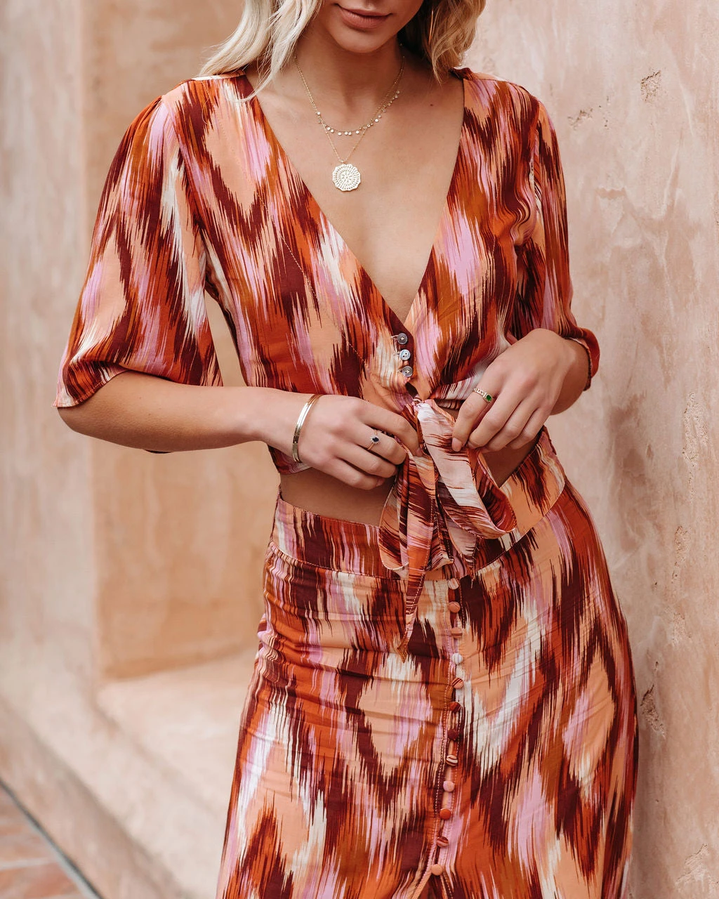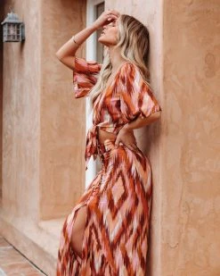 //VICI Exclusive// The Bowan Printed Tie Front Crop Top is a Tuscan style piece in rust, brown, lavender, mauve, peach, white, and cream complete with a fit-it-your-way front tie.