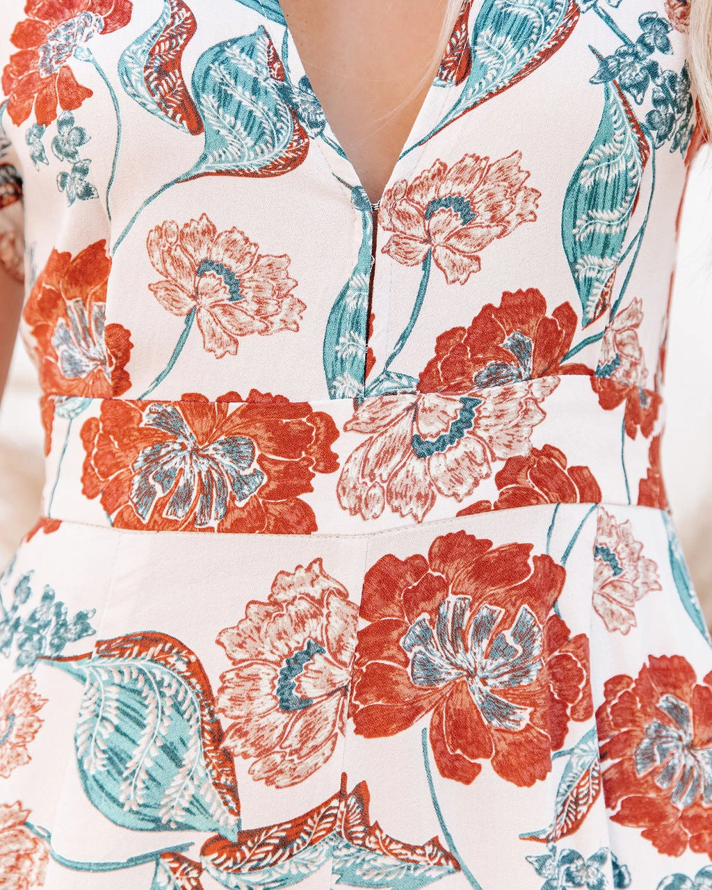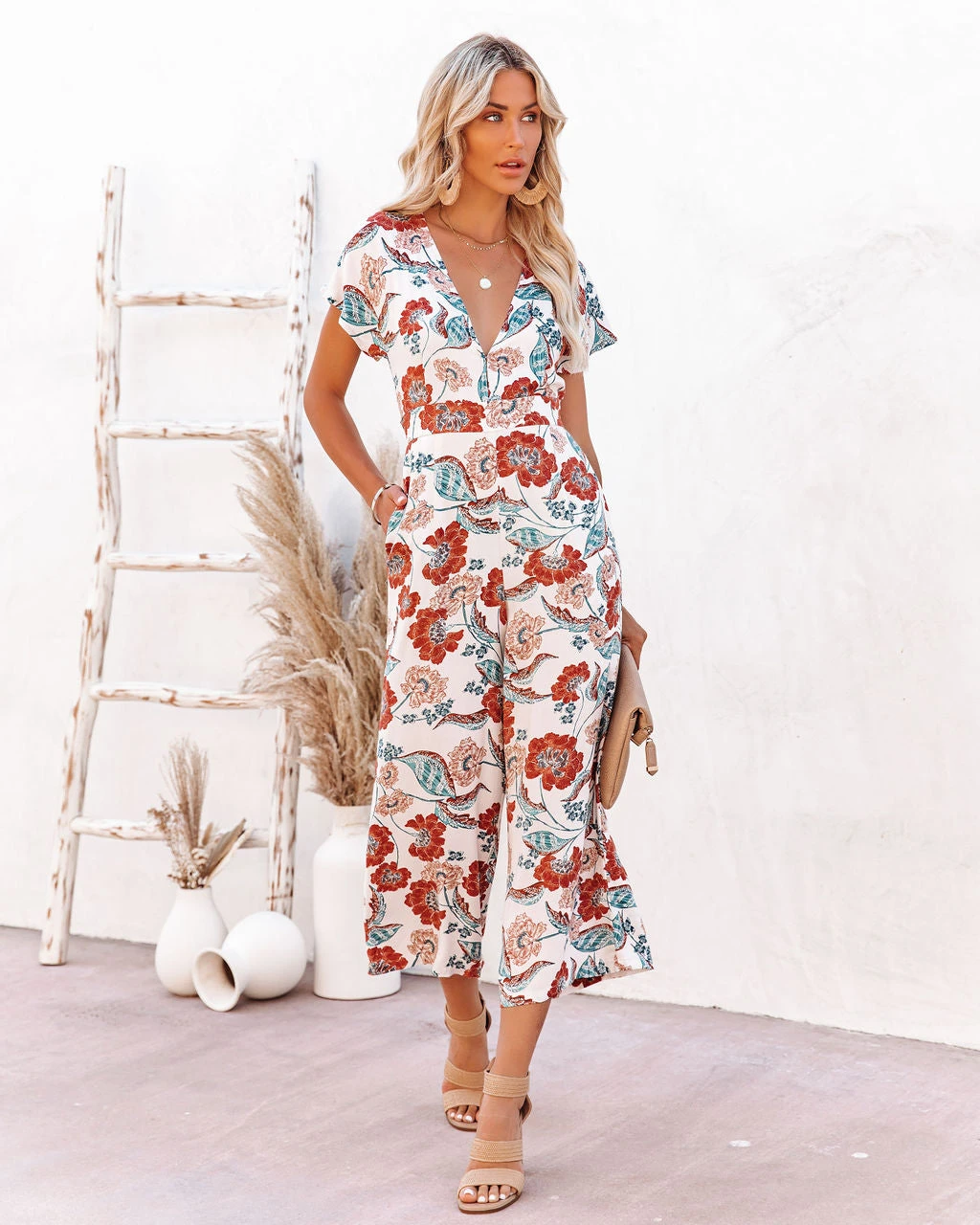 //VICI Exclusive// Hollow Floral Pocketed Tie Jumpsuit rendered with a vintage floral print in rust, pale yellow, sky blue and navy on a dusty ivory base. Fit with a plunging v-neckline secured by a hook and eye closure. Short flutter sleeves, relaxed pants, and an adjustable sewn waist tie to finish the look. Styled with the Brenyn Straw Statement Earrings, Chloe Mini Necklace, Compass Coin Necklace, Simple Bangle Bracelet, Stella Crossbody Envelope Zip Clutch, and Leila Block Heeled Sandal.
