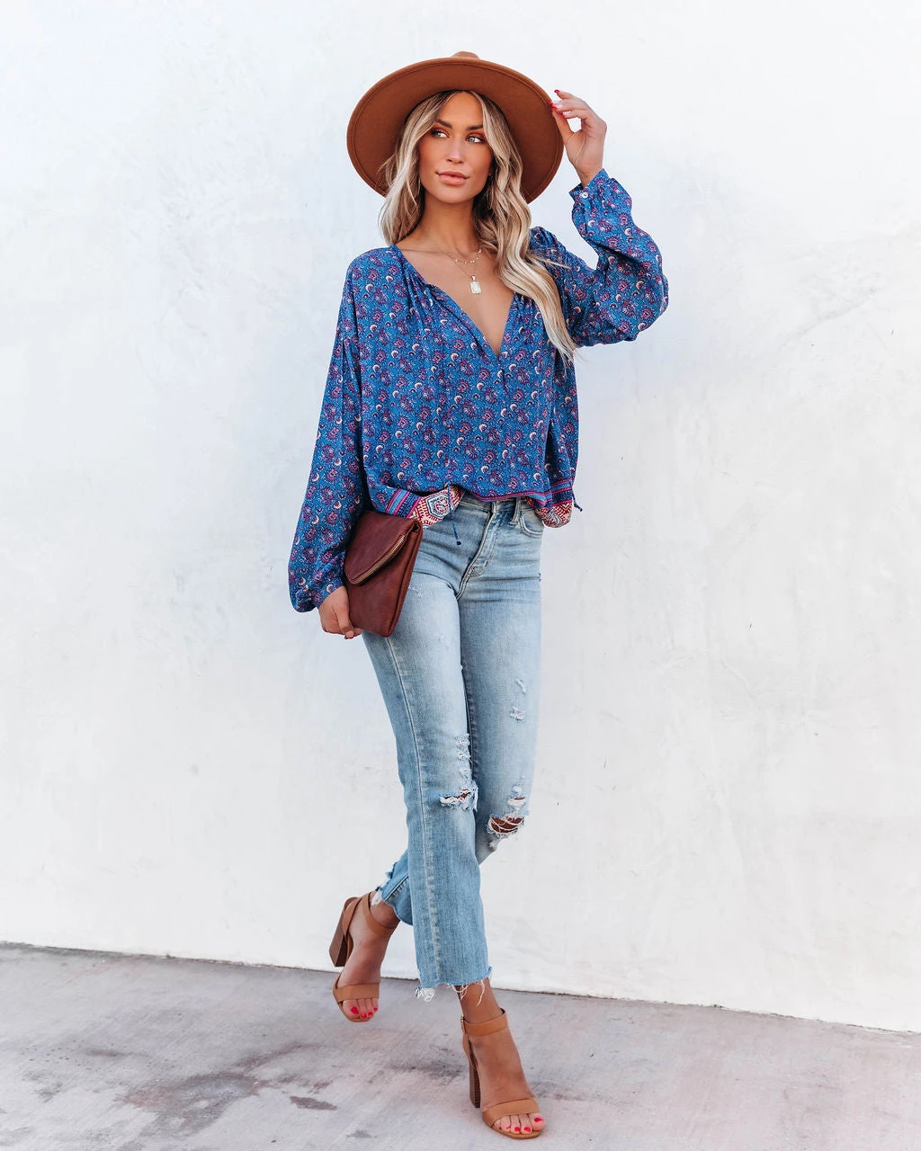 //VICI Exclusive//Best Selling Silhouette// We love a peasant style top! Our Luana Printed Peasant Top features blush, purple, fuchsia, dijon, and beige hues. Designed with a split neckline. Styled with the El Dorado Hat, Perfect Hoop Earrings, Chloe Mini Necklace, Initial Card Necklace, Mcguire High Rise Distressed Denim, Chandler Block Heeled Sandal, and Stella Crossbody Envelope Zip Clutch.