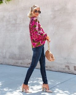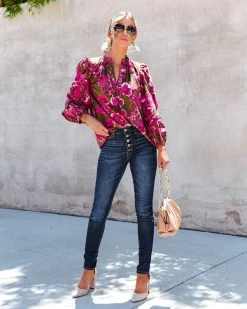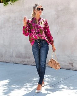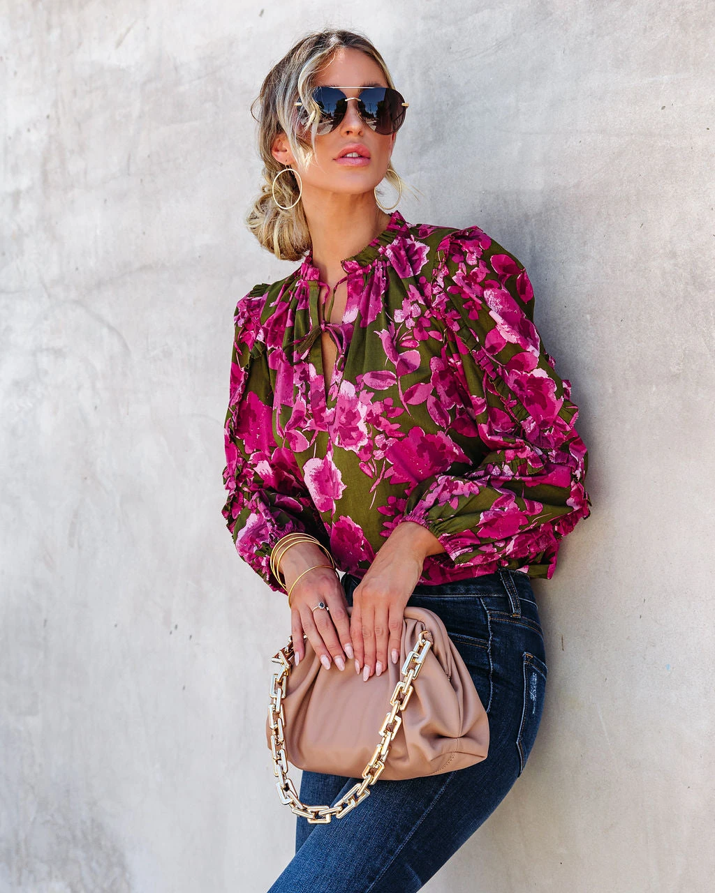 Upgrade your blouse collection in the Moraga Printed Ruffle Blouse in olive and fuchsia that features a split neckline.