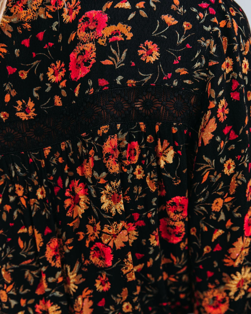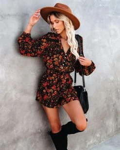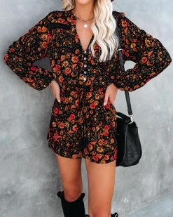 Our Plant Smiles, Harvest Love Button Down Romper is fall inspired with florals in mustard, salmon, wine, olive and sage on a black base! The true to size silhouette is elevated with crochet trimming and front button closures. Designed with a v-neckline, long sleeves and elastic cuffs. Pair with knee high boots for the cold weather ahead.