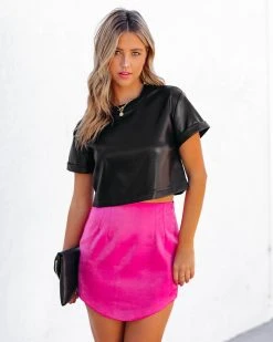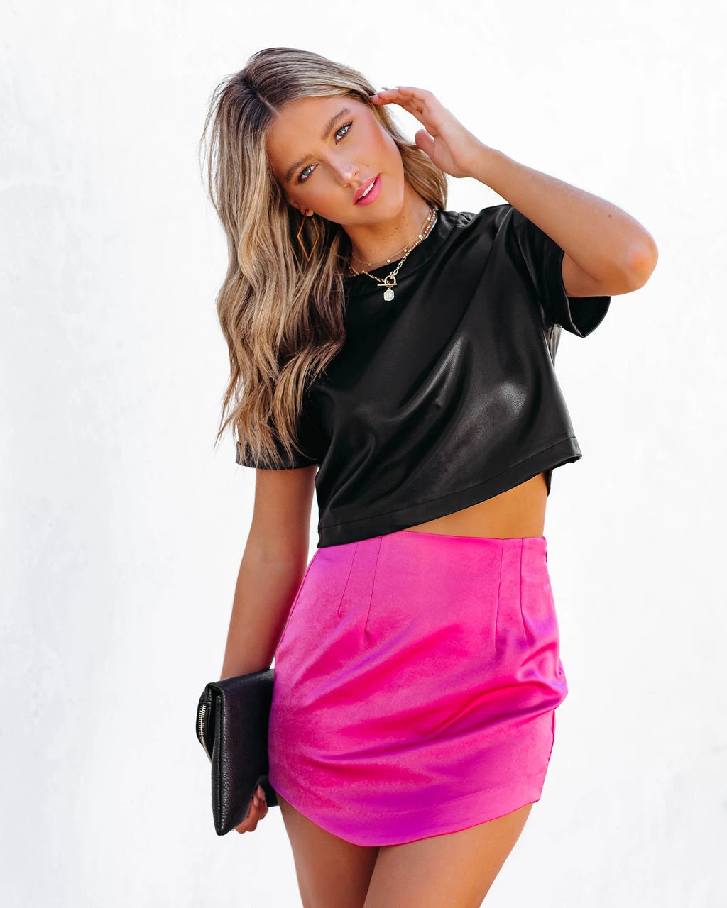 Our Shaya Faux Leather Crop Top is ready for a friday night out! This black crop top features a crew neckline. Designed with short sleeves and a back zipper closure. Styled with the Lori Angular Hoops, 5 Disc Choker, Sia Toggle Pendant Necklace, Minimal Herringbone Necklace, Stella Crossbody Envelope Zip Clutch, Tate Satin Mini Skirt, and Bella Faux Leather Strappy Kitten Heel.