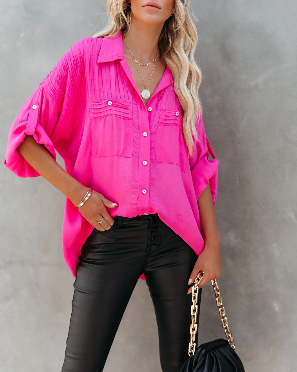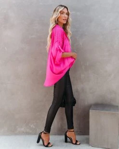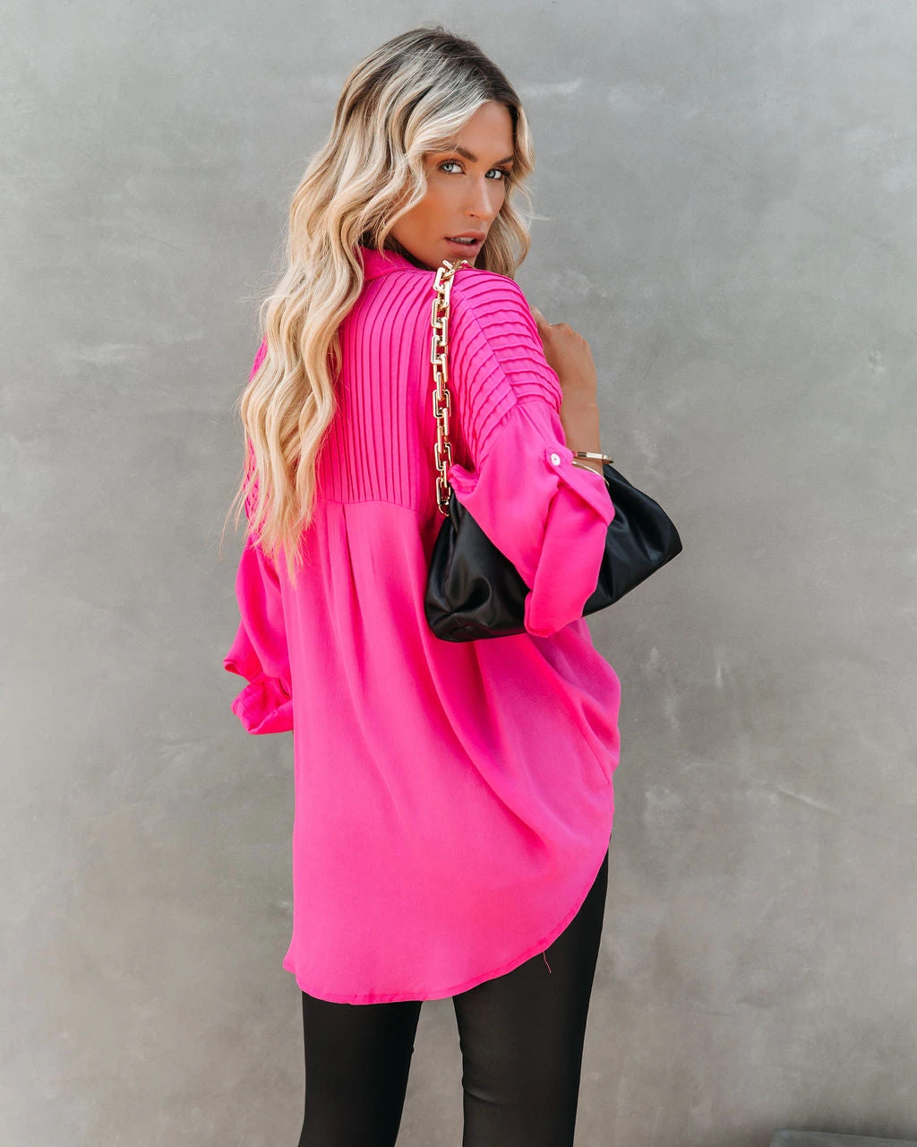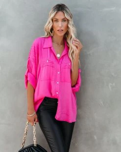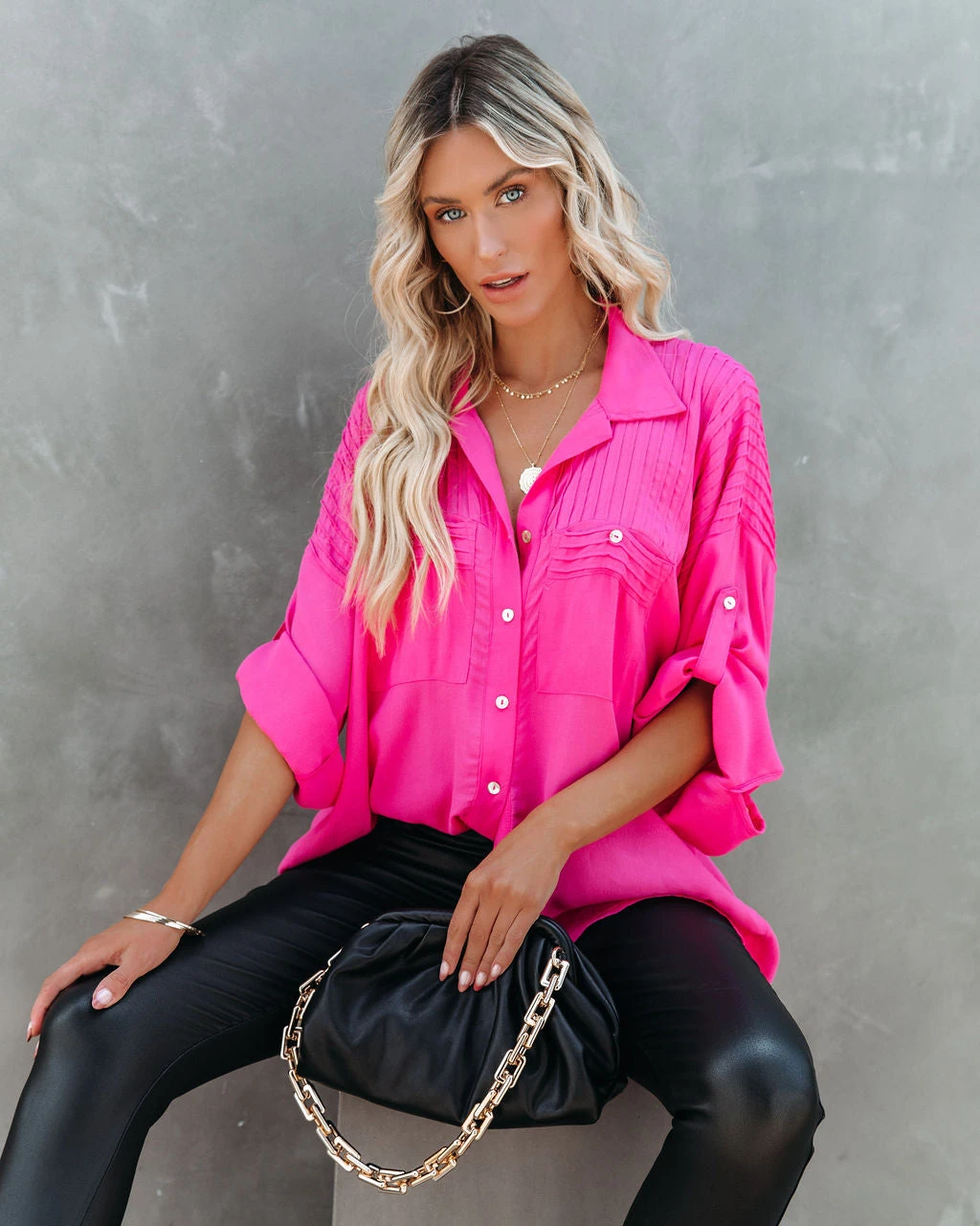 //VICI Exclusive//Best Seller// New Color// Let us tell you about the Too Good For You Button Down Top! This pink top features a relaxed fit with collared, button down front and ¾ roll tab sleeves. A great top to get down to work in, dolls! It has a subtle high low hemline and lightweight fabrication that makes this so flexible to style with. Styled with the Perfect Hoop Earrings, Chloe Mini Necklace, Mosaic Coin Necklace, Simple Bangle Bracelet, Chic Crossbody Chain Pouch Bag, Soho High Rise Coated Skinny, and Whimsy Heel.