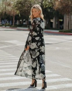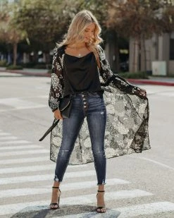 Our Caught A Vibe Velvet Burnout Duster fancies up any outfit! This black duster features ivory florals throughout. Secured with an adjustable drawstring waist tie. Finished with a relaxed fit. Styled with the Perfect Hoop Earrings, Chloe Mini Necklace, Compass Coin Necklace, Simple Bangle Bracelet, Chana Satin Cami Tank, Tilley Frayed Ankle High Waisted Skinny, and Whimsy Heel.Â