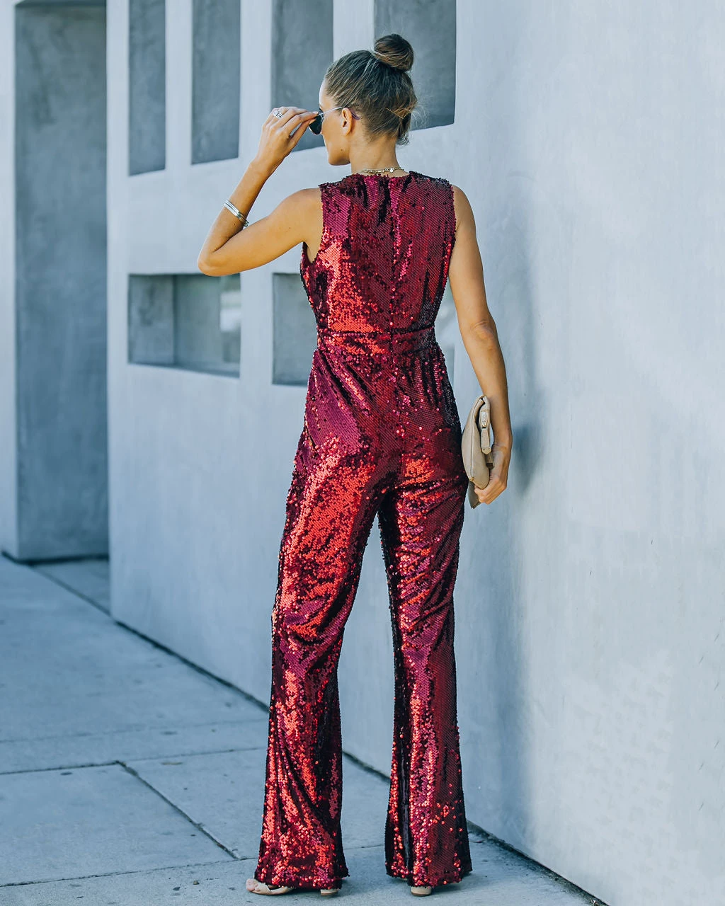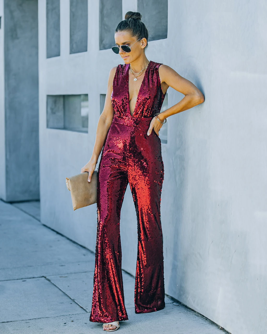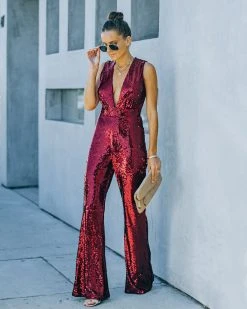//VICI Exclusive// Be the last one at the party in our Dancing on Air Sequin Jumpsuit! This bold burgundy hued number features a sultry plunging neckline. Secured with a concealed side zipper closure. Styled with the Chloe Mini Necklace, Compass Coin Necklace, Minimal Herringbone Necklace, Simple Bangle Bracelet, Stella Crossbody Envelope Zip Clutch, and Whimsy Heel.