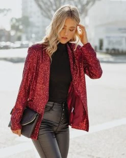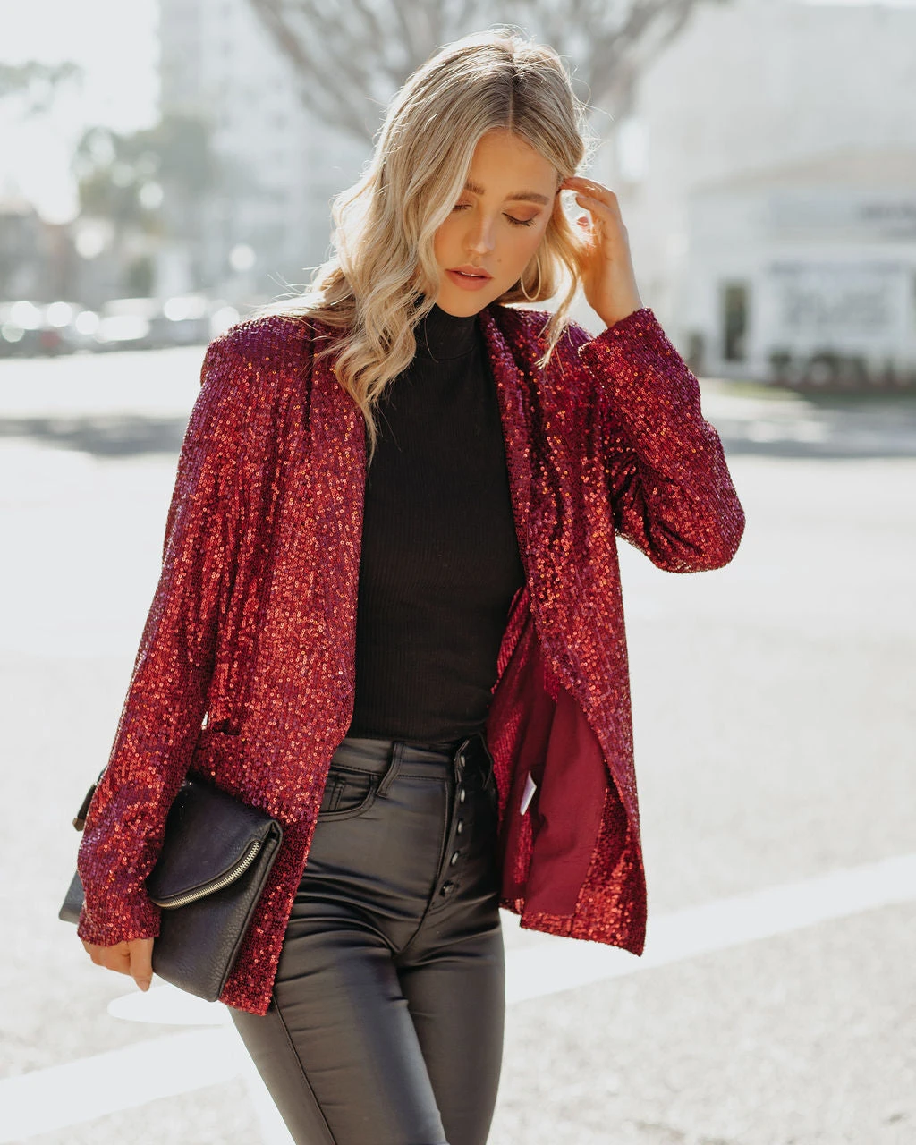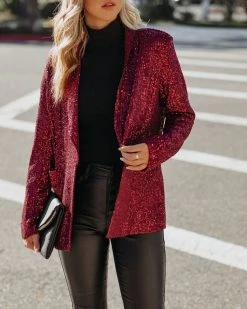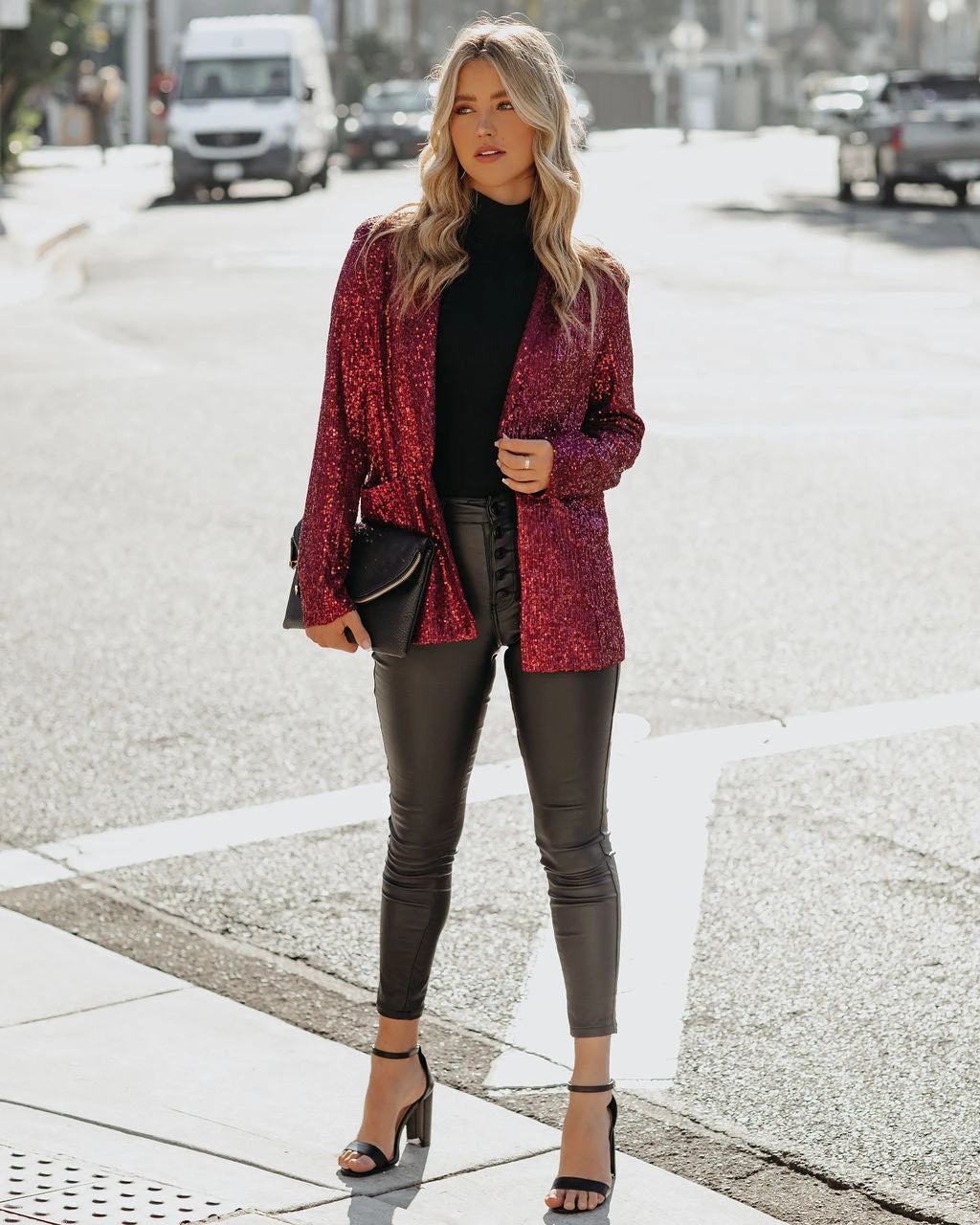 //VICI Exclusive//Best Selling Silhouette//New Color// Go for full out glam in this burgundy sequin set! Our Festive Flair Pocketed Sequin Blazer features side pockets and an open front. Finished with padded shoulders. Styled with the Perfect Hoop Earrings, Stella Crossbody Envelope Zip Clutch, Lissa Sleeveless Mock Neck Ribbed Top, Festive Flair Sequin High Rise Shorts, Soho High Rise Coated Skinny, and Whimsy Heel.