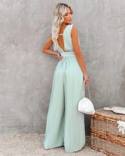//Best Seller// Be the best guest dressed at any event in our High Tea Pleated Wide Leg Belted Jumpsuit! This sage pleated jumpsuit has a wide leg and a draped neckline.
