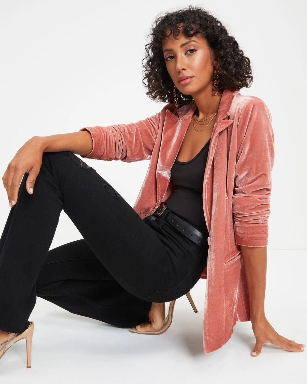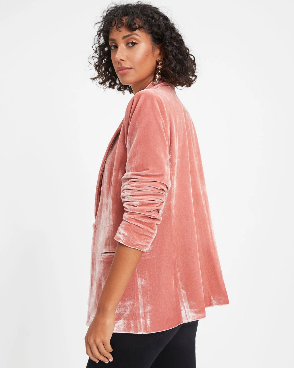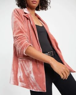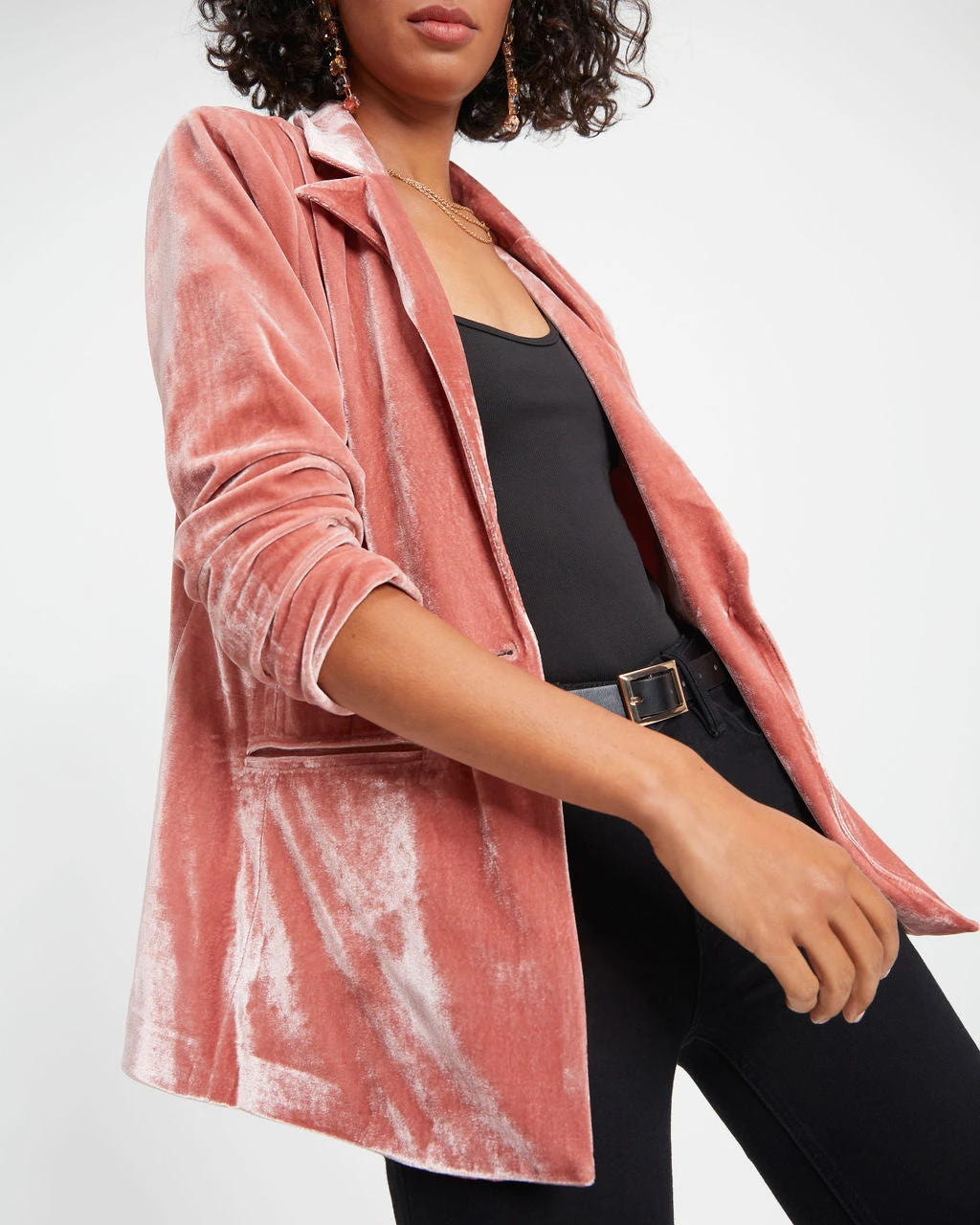 Get ready for social season in the Katherina Velvet Blazer in rose that features slit pockets.