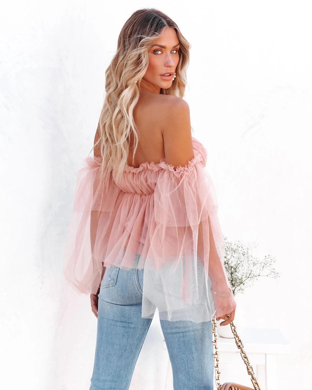 Feel like a ballerina in the Renley Off The Shoulder Tulle Blouse in a blush hue with frilly, feminine tulle sleeves.
