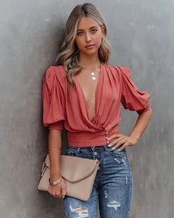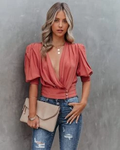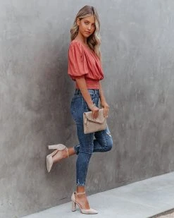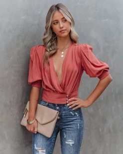 Transition from summer to fall in our Within Reach Wrap Crop Top! This clay true wrap top is designed with a draped neckline and gathered sleeves. Secured with inner and outer button closures. Styled with the Perfect Hoop Earrings, Chloe Mini Necklace, Compass Coin Necklace, Elena Pendant Necklace, Simple Bangle Bracelet, Stella Crossbody Envelope Zip Clutch, Ultimate High Rise Split Ankle Distressed Skinny, and Ritz Faux Suede Pointed Heel.