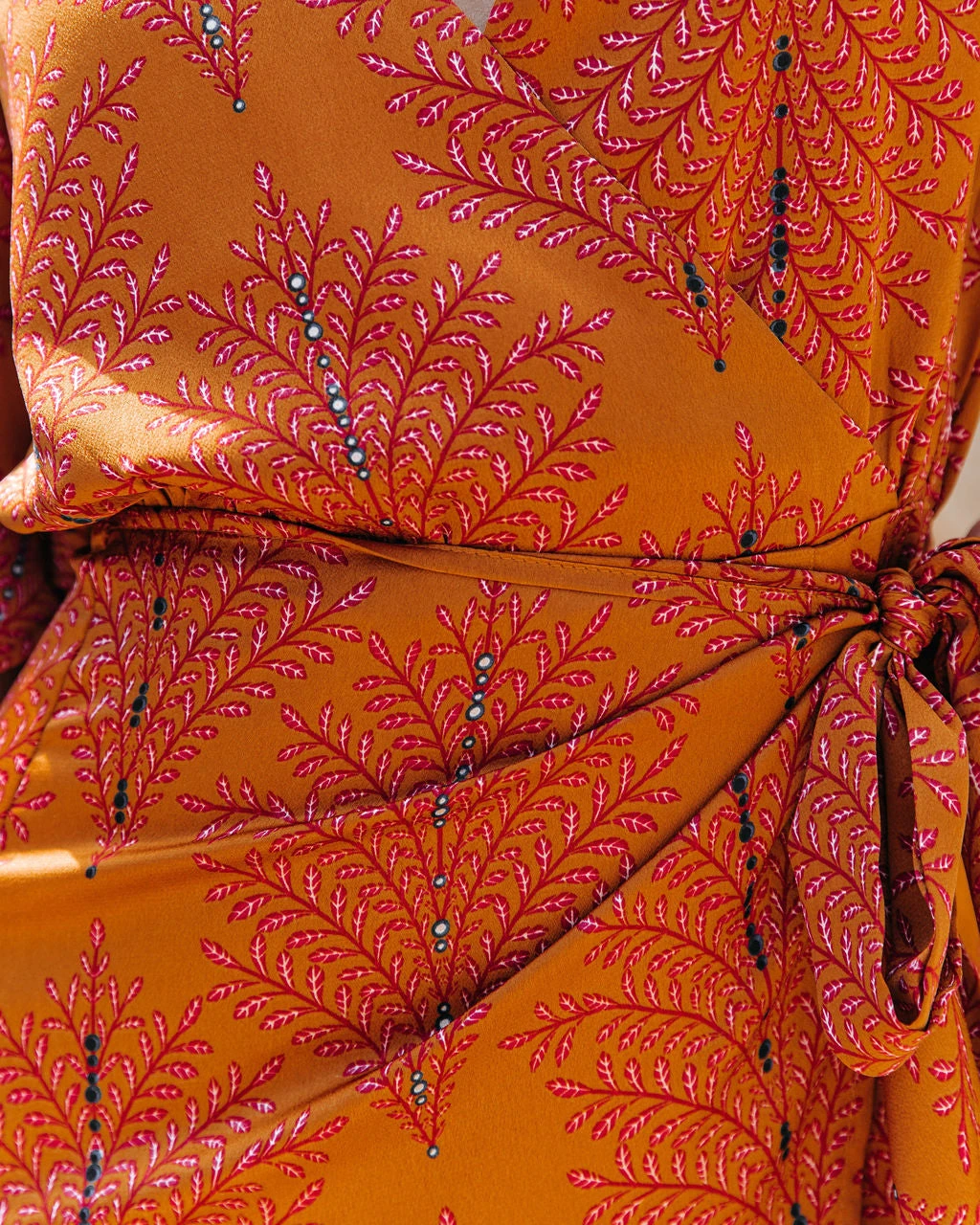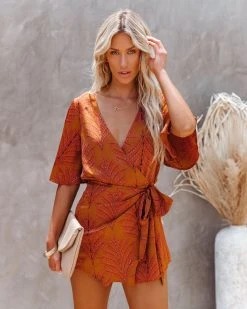 //Best Seller// Our Hartman Printed Satin Wrap Romper is so decorative! This bronzed orange beauty is decorated with red, navy, and off white prints. Finished with a draped neckline and a structured waist.