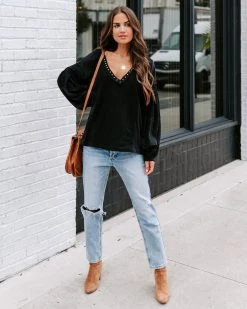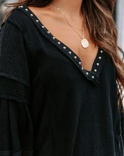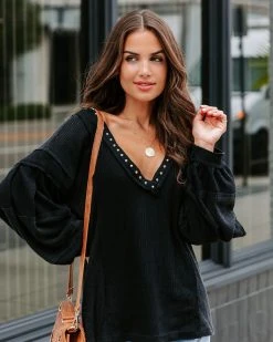Cool meets cute in the Axel Studded Waffle Knit Long Sleeve Top in black that features a v-neckline
