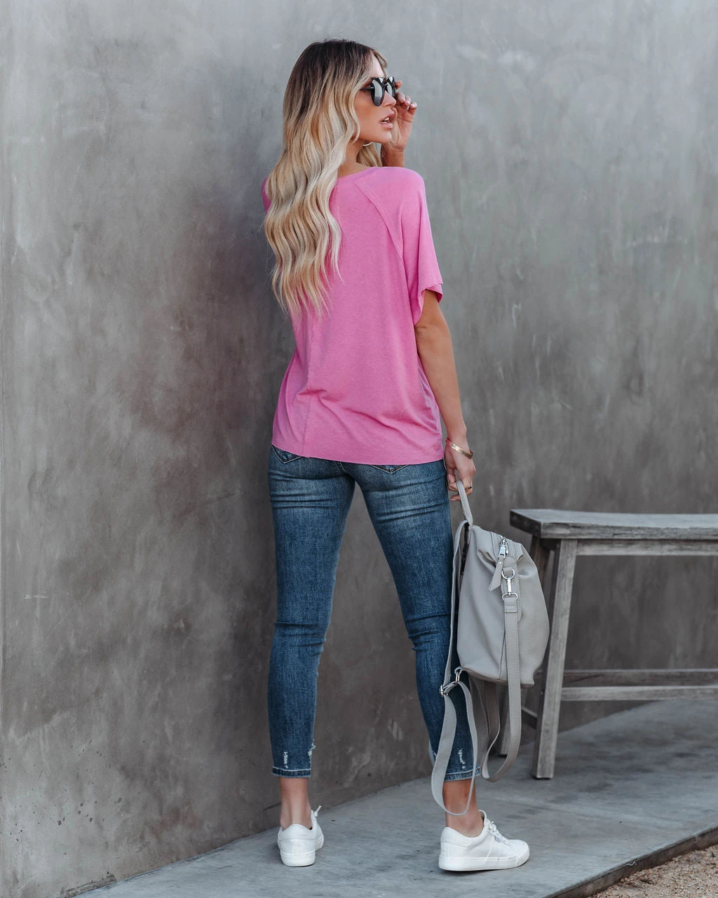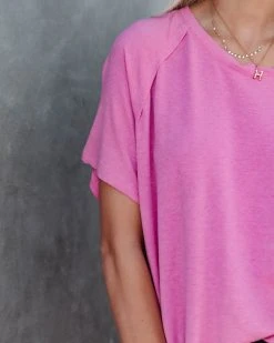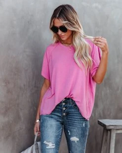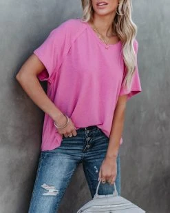 //Best Seller//New Color// Our Jaxon Cotton Blend Unfinished Tee is a casual as it gets! This bubblegum pink colored top features raw cut edges. Designed with a wide neckline and short sleeves. Styled with the Lenox Black Frame Grey Gradient Aviator Sunglasses, Perfect Hoop Earrings, Chloe Mini Necklace, Bamboo Initial Pendant Necklace, Simple Bangle Bracelet, Ultimate High Rise Split Ankle Distressed Skinny, Kenzie Backpack, and Common Thread Sneaker.