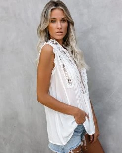 //VICI Exclusive// Our Peace Within Crochet Lace Top is ornately detailed with crochet lace topping the bodice. This top features a white hue on a lightweight and soft body. Fit with a split v-neckline trimmed with crochet lace details. Includes pin tucking throughout and a front button-down closure finish the look. This top makes a statement and looks fab with a distressed pair of skinnies or shorts! Effortlessly tuck in for an easy summer look. Styled with the Hazel High Rise Distressed Denim Shorts.