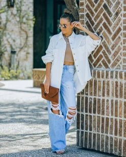 //VICI Exclusive//Best Seller// Upgrade your outerwear in our Thinking Out Loud Cotton Distressed Denim Jacket! This off white piece is designed with a collar and bust pockets. Finished with front button closures. Styled with the Chloe Mini Necklace, Minimal Herringbone Necklace, Compass Coin Necklace, Simple Bangle Bracelet, Stella Crossbody Envelope Zip Clutch, Kiki Knit Crop Top, Zaya High Rise Distressed Denim, and Whimsy Heel.