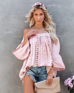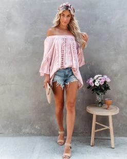 Our Pisces Crochet Lace Off The Shoulder Tunic can be worn as a dress or shirt! This ginger off the shoulder top features a ladder lace trim across the front. The wide sleeves make this top so whimsical. Styled with the Shamas Chevron Twist Headband, Perfect Hoop Earrings, Redid Chain Necklace, The Buddha Wheel Necklace, Stella Crossbody Envelope Zip Clutch, Hazel High Rise Distressed Denim Shorts, and Cooper Block Heeled Sandal.