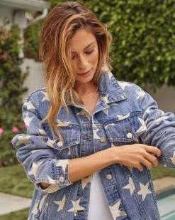 This denim star set is all you need for your Fourth Of July fit! Our Starlit Pocketed Denim Jacket looks amazing with the matching shorts and a strapless top. Cream stars decorate the dark wash base on this collared piece. Styled with the Lenox Gold Frame Brown Gradient Aviator Sunglasses, Etoile Striped Earrings, Compass Coin Necklace, Playa Ribbed Snap Front One Piece, Talent Strapless Knit Bodysuit, Starlit High Rise Paper Bag Waist Denim Shorts, and Rory Braided Espadrille Slide Sandal.