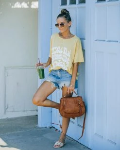 So groovy is our I Got That Summertime Kindness Cotton Tee! This yellow relaxed tee features a white front graphic in 70’s inspired letters. Designed with a wide neckline and half sleeves. Styled with the Wellness Layered Pendant Necklace, Compass Coin Necklace, Simple Bangle Bracelet, Highland Bag, Hazel High Rise Distressed Denim Shorts, and Rex Faux Leather Sandal.