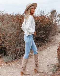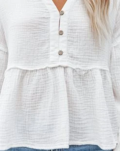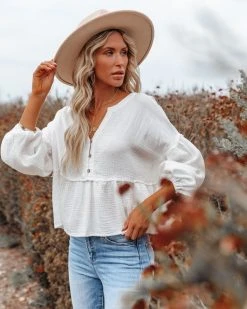 Boho meets office wear in our Havasu Crop Babydoll Top! This classic white worn in babydoll top is decorated with front button closures. Designed with a split neckline and a cropped fit. Styled with the El Dorado Hat, Perfect Hoop Earrings, Chloe Mini Necklace, Compass Coin Necklace, Trecca High Rise Distressed Skinny, and the Saint Slouch Boot.