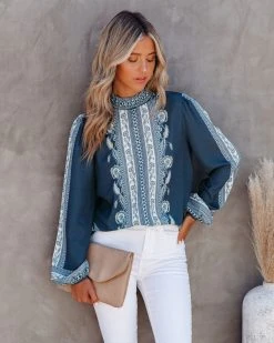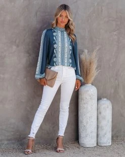 Posh sophistication takes form in our Aven Printed Blouse that has a ruched mock neckline! The charcoal base is contrasted with a ivory, green, and blue floral striped print throughout. Wear this blouse work to weekend! Paired with Indigo Twisted Hoops, Stella Crossbody Envelope Zip Clutch, Monique High Rise Frayed Ankle Skinny, and Whimsy Heel.