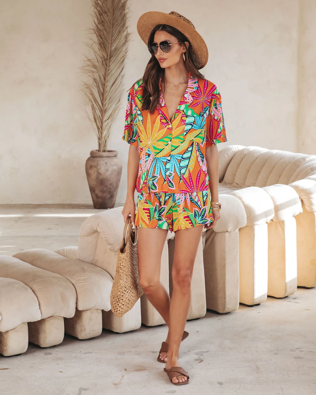 Perfect for your vacay, the Barbados Girl Printed Button Down Top in orange multi features a relaxed fit.