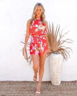 Our Brenda Floral Ruffle Romper is made for warm weathered special occasions! This red romper is decorated with lavender, fuchsia, olive, sage, pale yellow, ivory, sky blue, and light blue florals. Finished with an adjustable waist tie. Styled with the French Twist Hoops, Simple Bangle Bracelet, Stella Crossbody Envelope Zip Clutch, and Whimsy Heel.Β