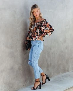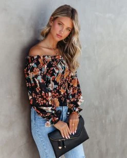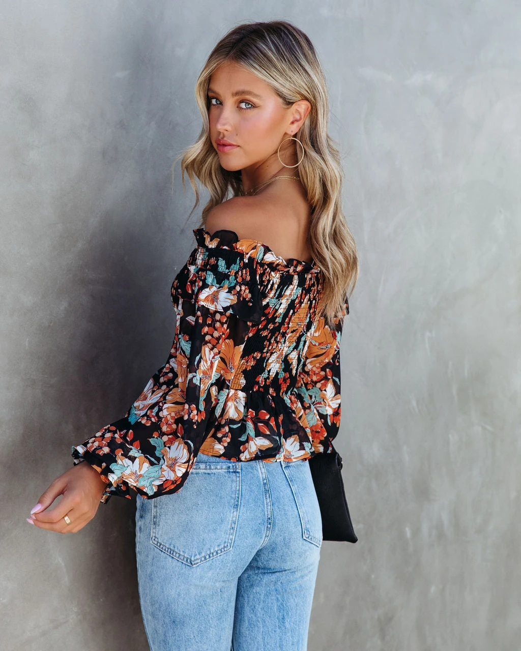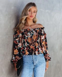Boho and pretty, the Bruna Floral Smocked Off The Shoulder Top in black multi features elastic cuffs.