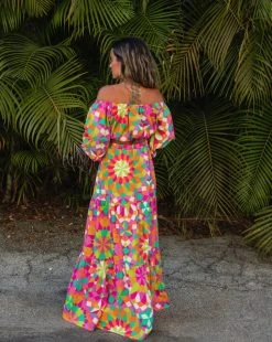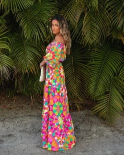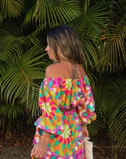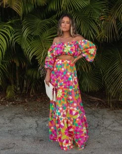 Weβre getting vibrant vibes from the Down In Rio Cotton Printed Off The Shoulder Top thatβs part of a bold colorful set with the Down In Rio Cotton Printed Tiered Maxi Skirt.Β