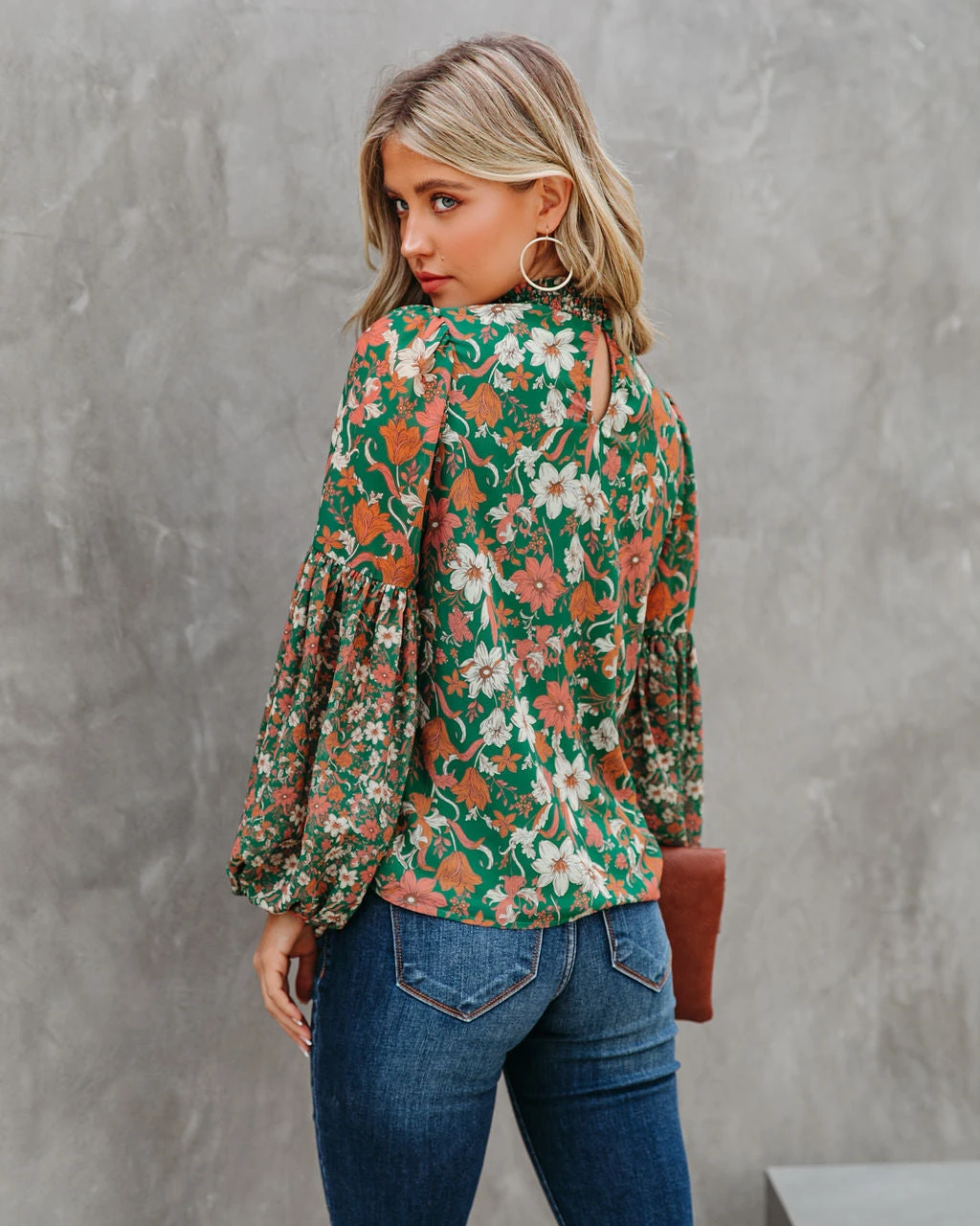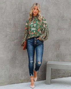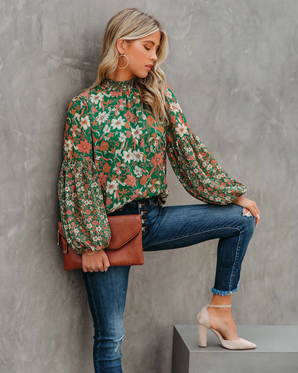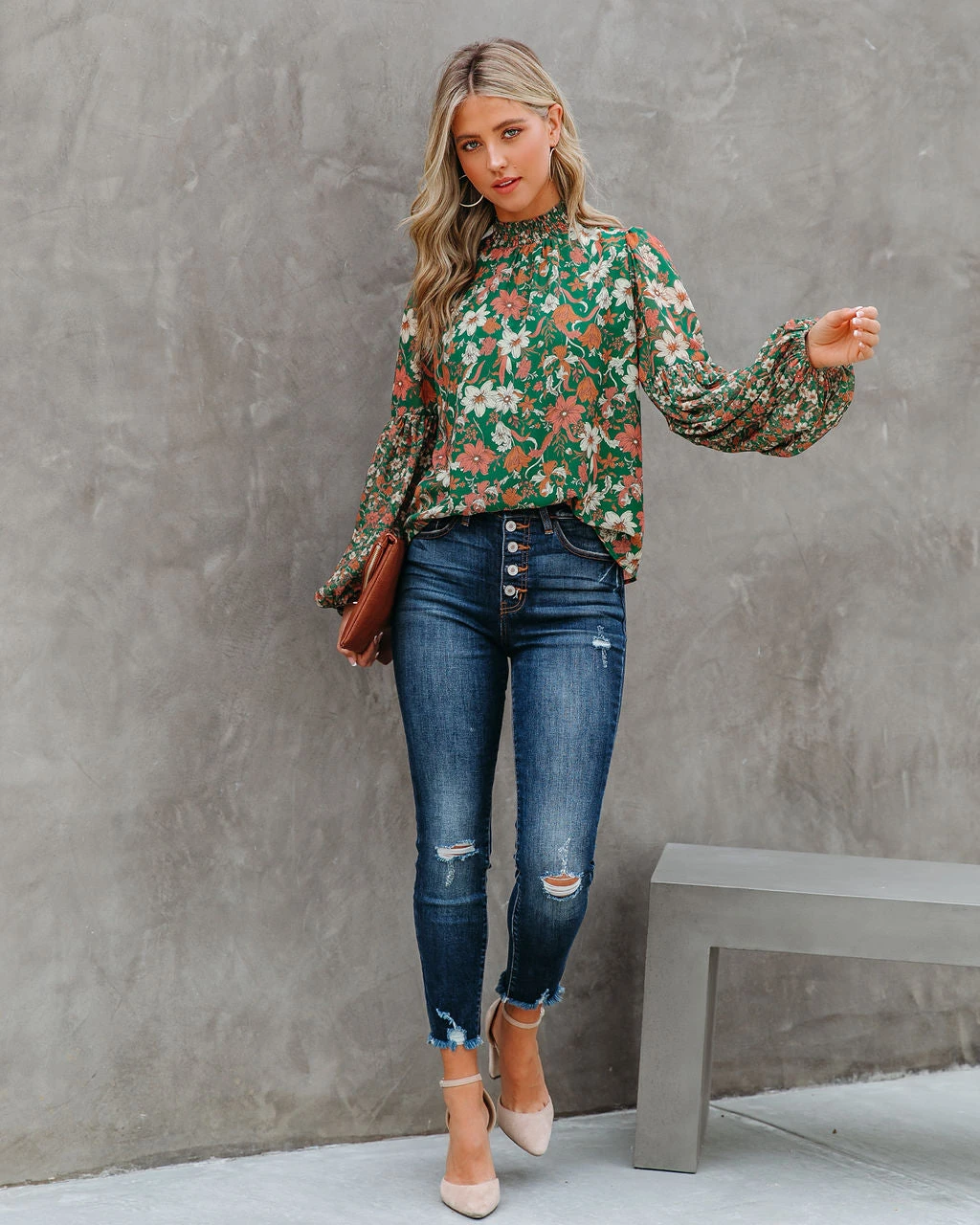 We’re loving all of the fall florals this season! Our Evander Floral Balloon Sleeve Blouse is green with rust, salmon, and cream florals throughout. The mock neckline and billowed sleeves give this top a unique touch. Styled with the Perfect Hoop Earrings, Stella Crossbody Envelope Zip Clutch, Tilley Frayed Ankle High Waisted Skinny, and Ritz Faux Suede Pointed Heel.