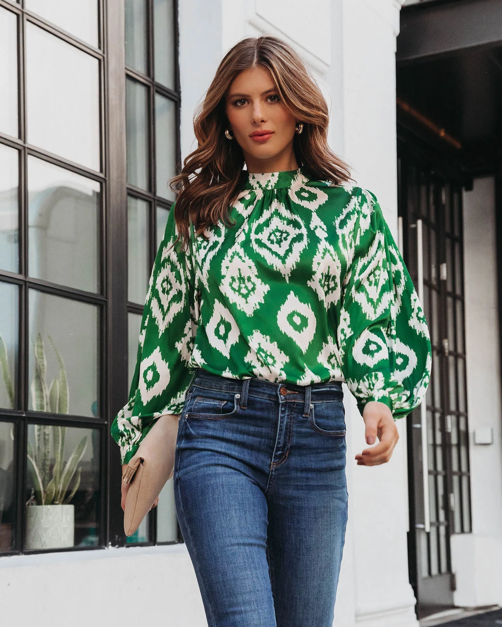 Cue up office compliments in the Holiday In Arizona Printed Mock Neck Top in green that features a high neckline.