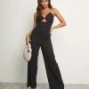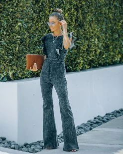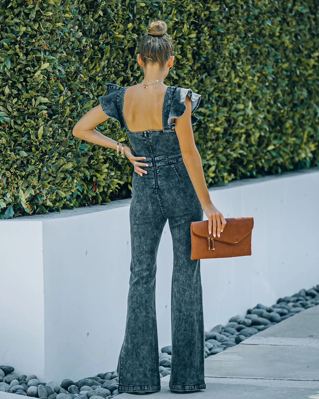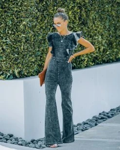 Our Jonesy Cotton Blend Flared Denim Jumpsuit is so fitted and flattering! This black acid wash piece is detailed with a flared leg and ruffle trimmed shoulders. Secured with a back zipper closure. Styled with the Chloe Mini Necklace, Minimal Herringbone Necklace, Compass Coin Necklace, Simple Bangle Bracelet, Stella Crossbody Envelope Zip Clutch, and Whimsy Heel.