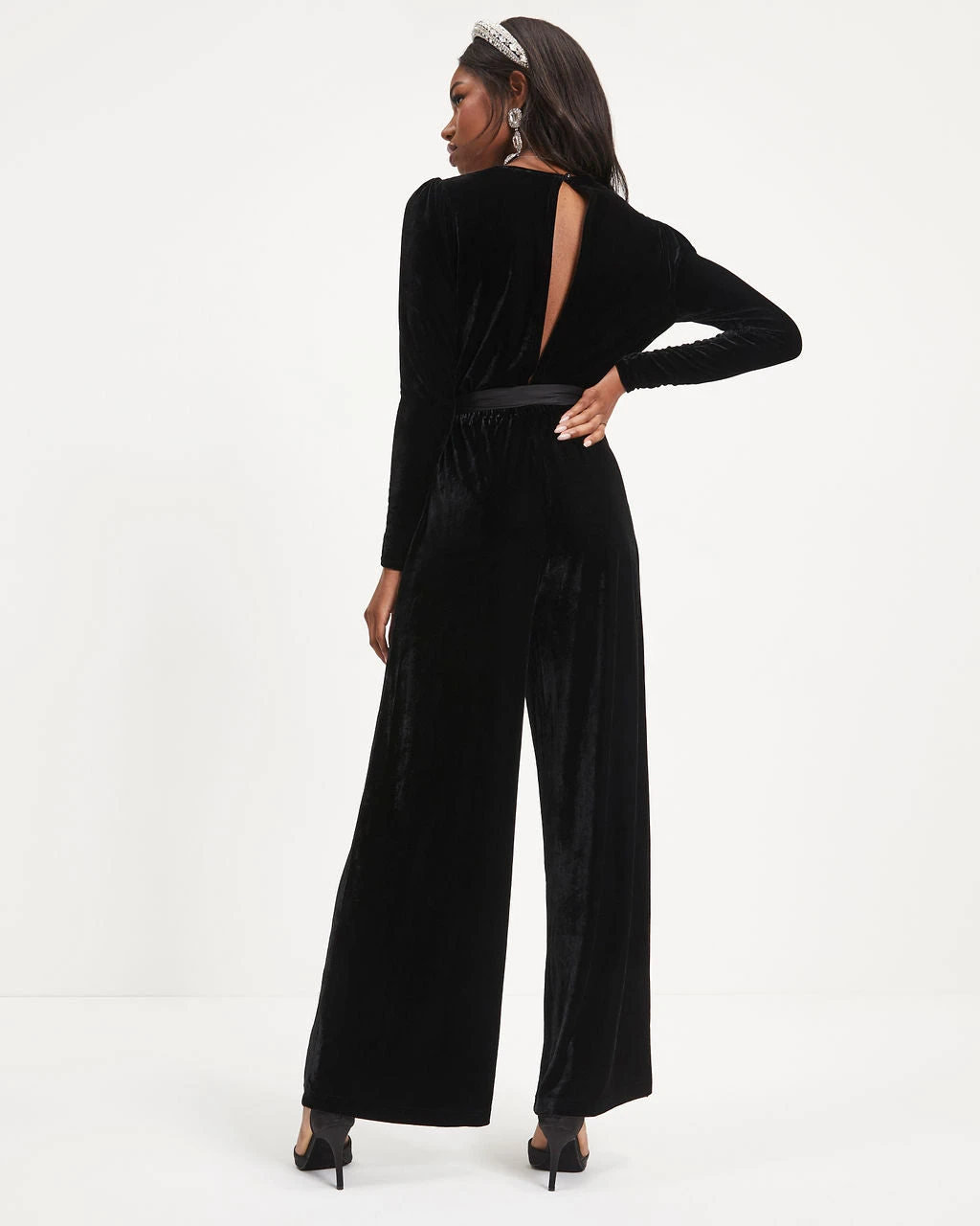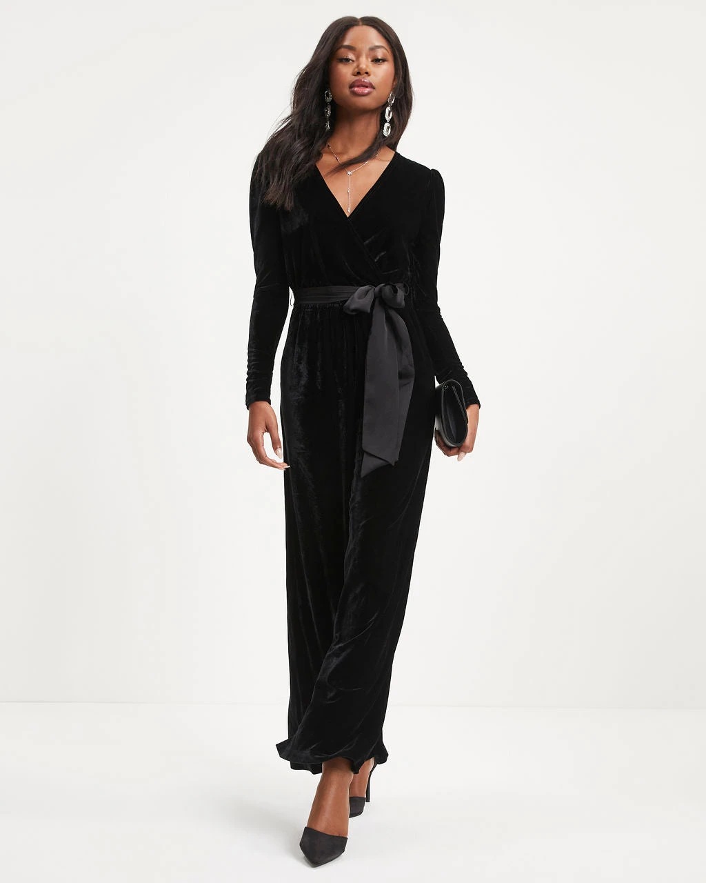 Fancy meets festive in the Love One Another Velvet Pocketed Cutout Back Jumpsuit in black that features a satin waist tie.