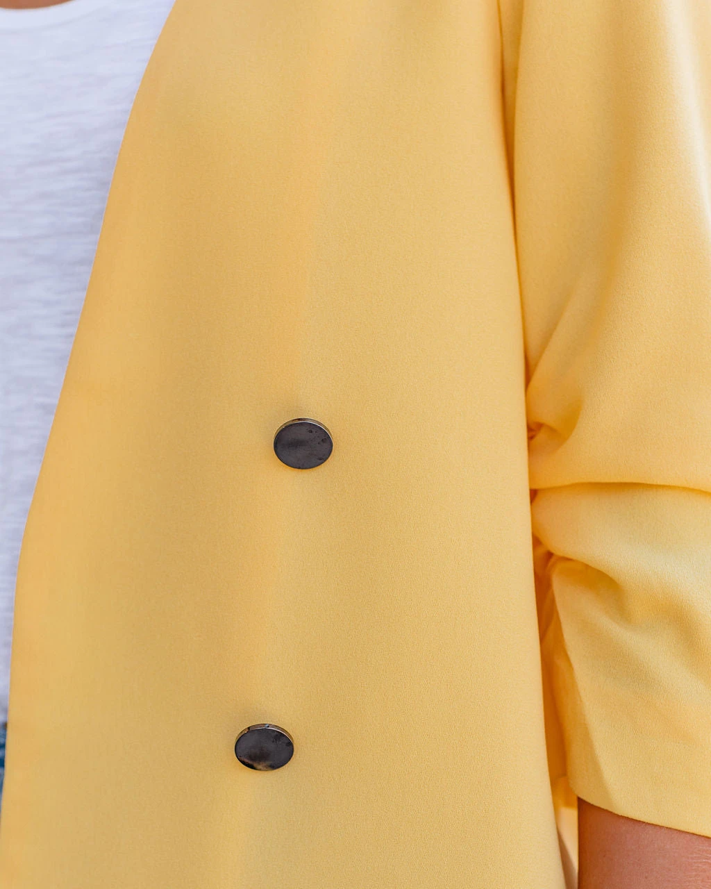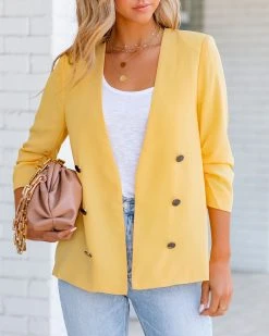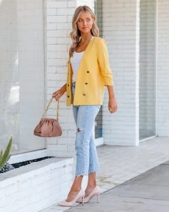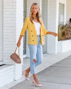 Make a statement in this bright yellow blazer! Our Mercedes Ruched Sleeve Blazer features non removable padded shoulders and a back slit. The decorative, gunmetal buttons add elegant detail. Styled with the Indigo Twisted Hoops, 5 Disc Choker, Compass Coin Necklace, Shayne Gold Link Necklace, Wellness Layered Pendant, Chic Crossbody Chain Pouch Bag, Kason Distressed High Rise Denim, and Lavish Pumps.