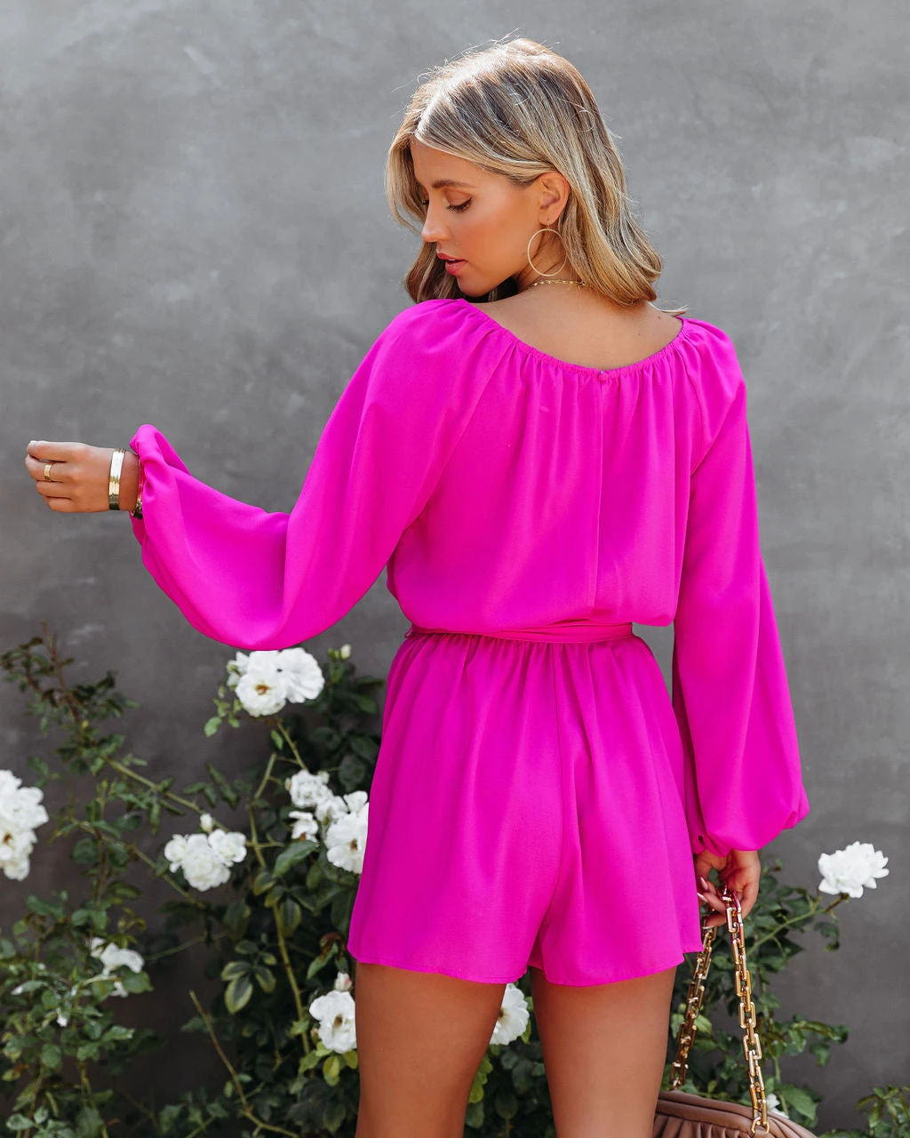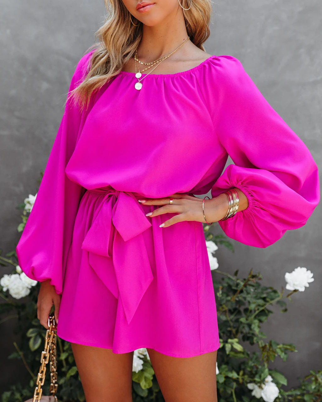Add a pretty pop of color to your wardrobe in our Missa Billowed Tie Romper! This magenta romper is designed with a wide neckline and a back button closure. Finished with a back button closure. Styled with the Perfect Hoop Earrings, Compass Coin Necklace, Elena Pendant Necklace, Chloe Mini Necklace, Simple Bangle Bracelet, Chic Crossbody Chain Pouch Bag, and Lavish Patent Leather Pumps.