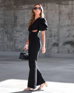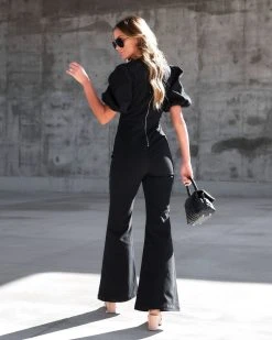 One & done! Perfect for day or night, the Sarah Denim Puff Sleeve Flare Jumpsuit in Black just became an instant favorite.