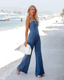 You’ll love to throw on our So Mila Denim Flare Jumpsuit in medium indigo that features a flare pant.