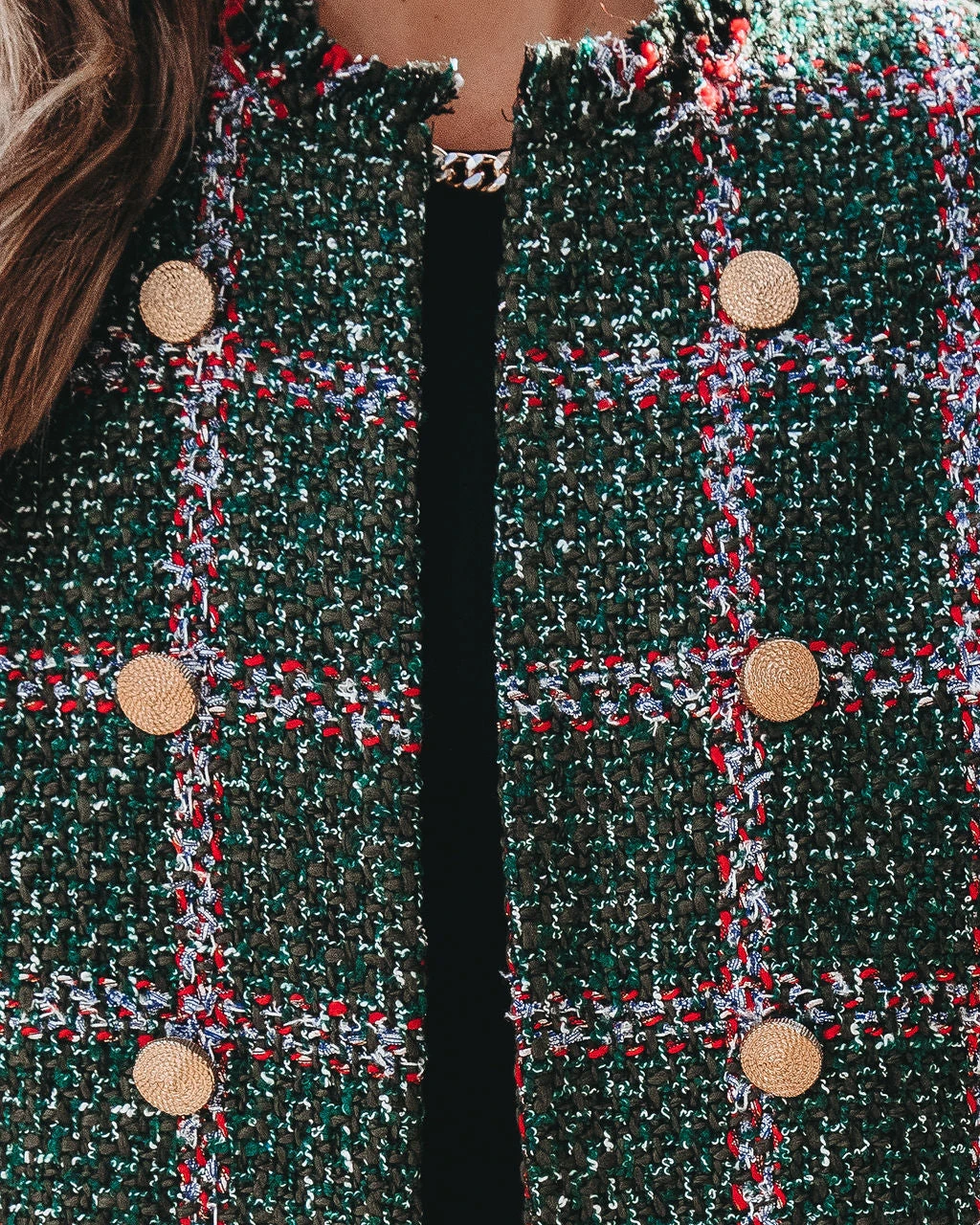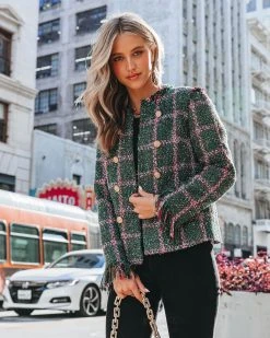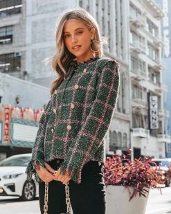 Prep up your wardrobe in the Tory Tweed Fringe Blazer in green that features gold button closures.