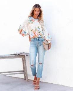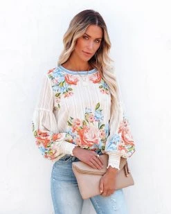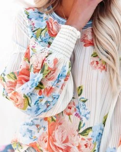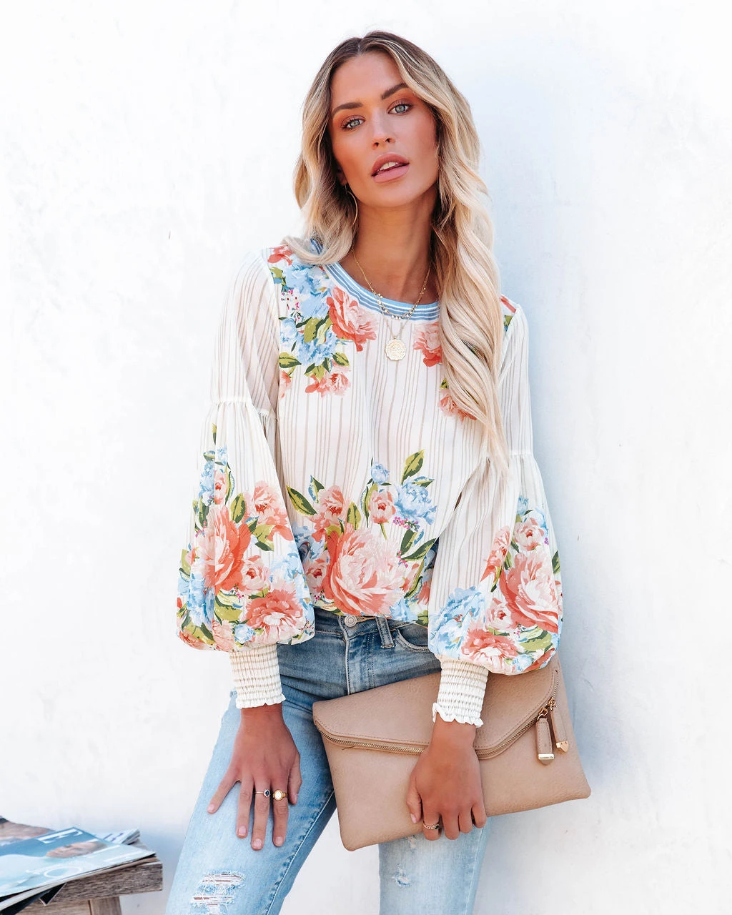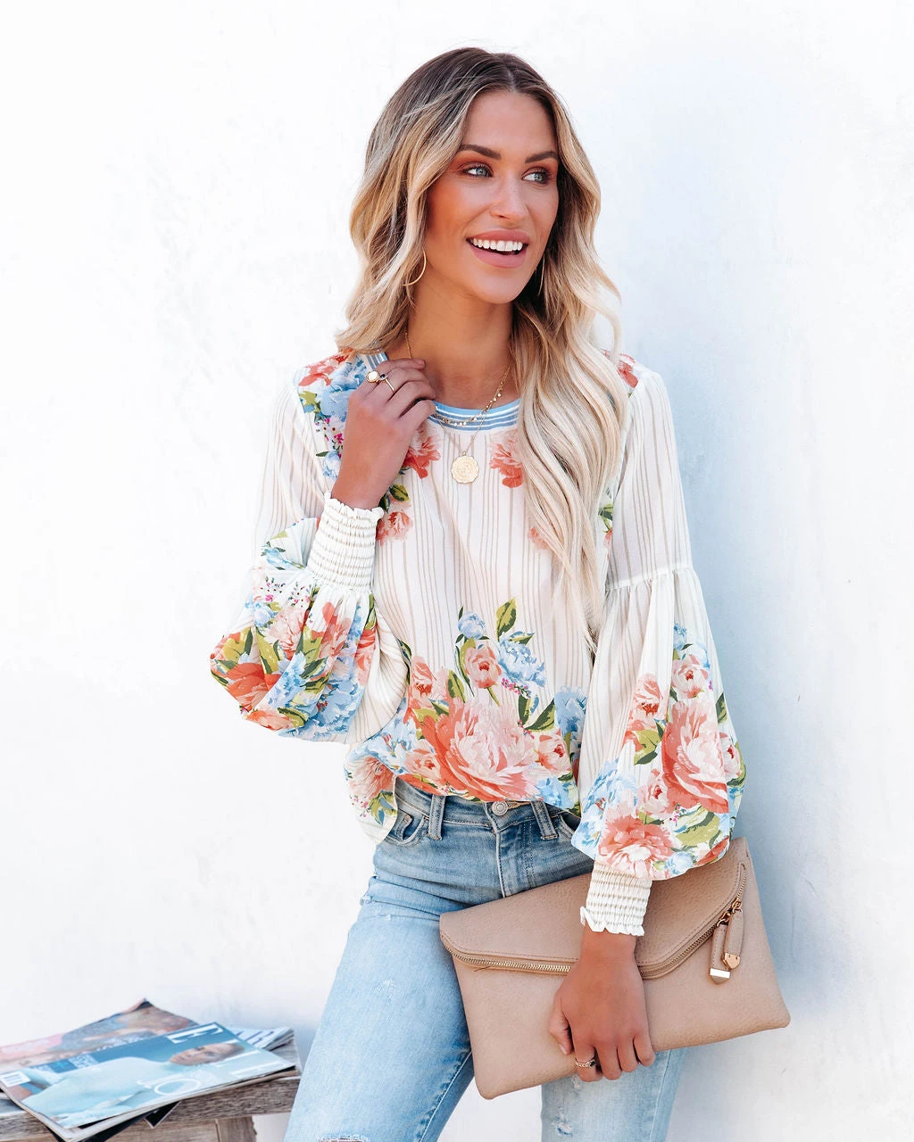//VICI Exclusive //Best Seller// New Color// The Valencia Rose Printed Blouse in off white and beige stripes is accented with ivory, beige, blue, peach, olive, and sage florals throughout.