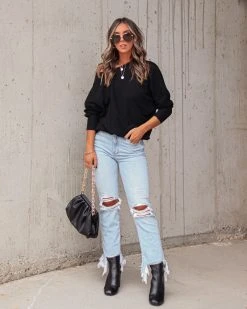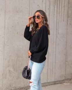 Classic meets comfy in the Fitch Waffle Knit Dolman Long Sleeve Top in black that features a wide neckline.