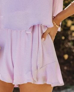 Effortless and breezy, the Sweet As Sugar Ruffle Romper in dusty lilac features a flowy top shelf and fixed straps.