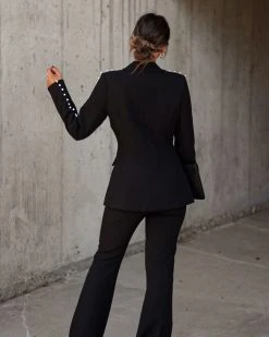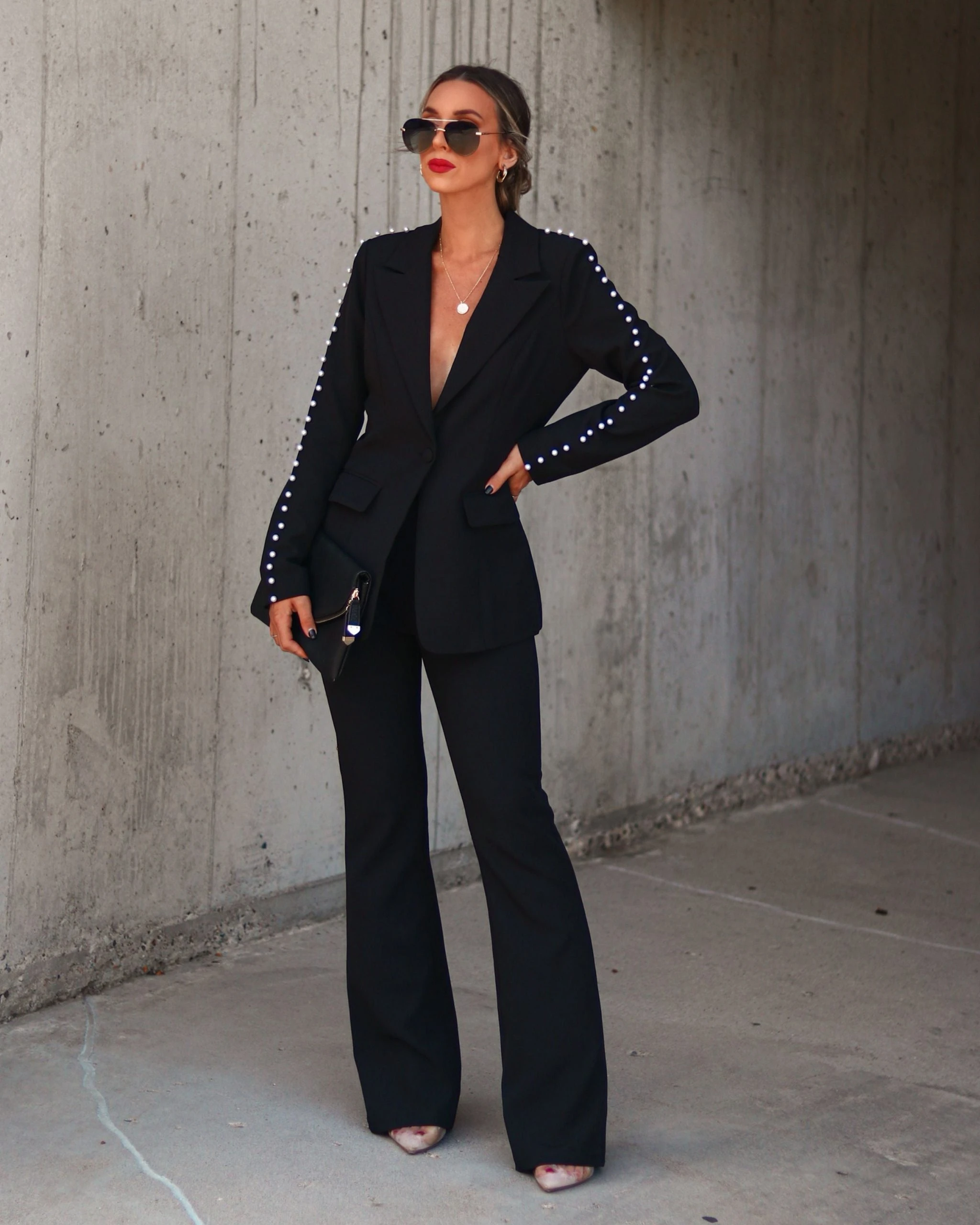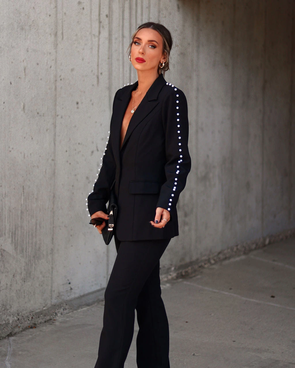 Boss babes will love the Michella Pocketed Pearl Blazer in black that features a pearl trimming.