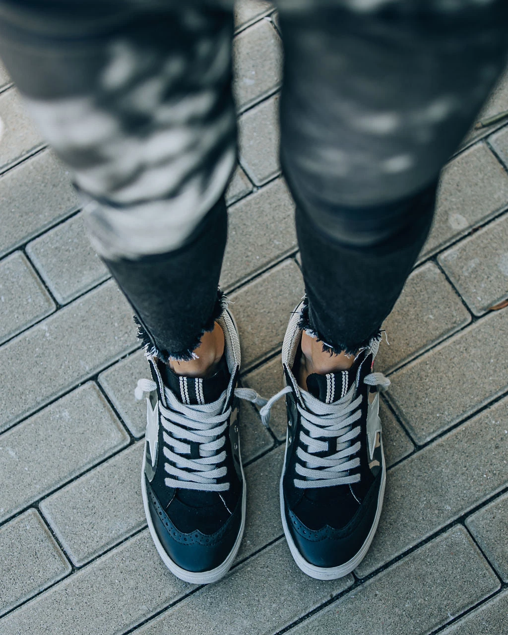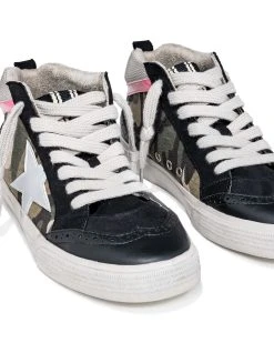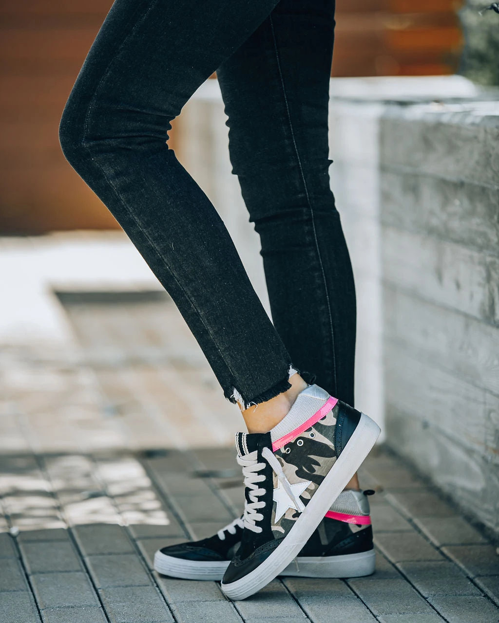 //Best Seller// The Liam High-Top Camo Sneaker features black, green, olive, cream, silver, beige, taupe, and pink camo printed sneaker features a silver star.