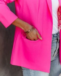 Go for a sophisticated look in our Boss Up Pocketed Blazer! This hot pink blazer features shoulder pads. Designed with an open front and a notched collar. Finished with long sleeves. Styled with the Lenox Black Frame Grey Gradient Aviator Sunglasses, Perfect Hoop Earrings, Chloe Mini Necklace, Republique Dual Pendant Necklace, Simple Bangle Bracelet, Kip Seamless Scoop Tank, Mcguire High Rise Distressed Denim, Ritz Faux Suede Pointed Heel, and Stella Crossbody Envelope Zip Clutch.Â