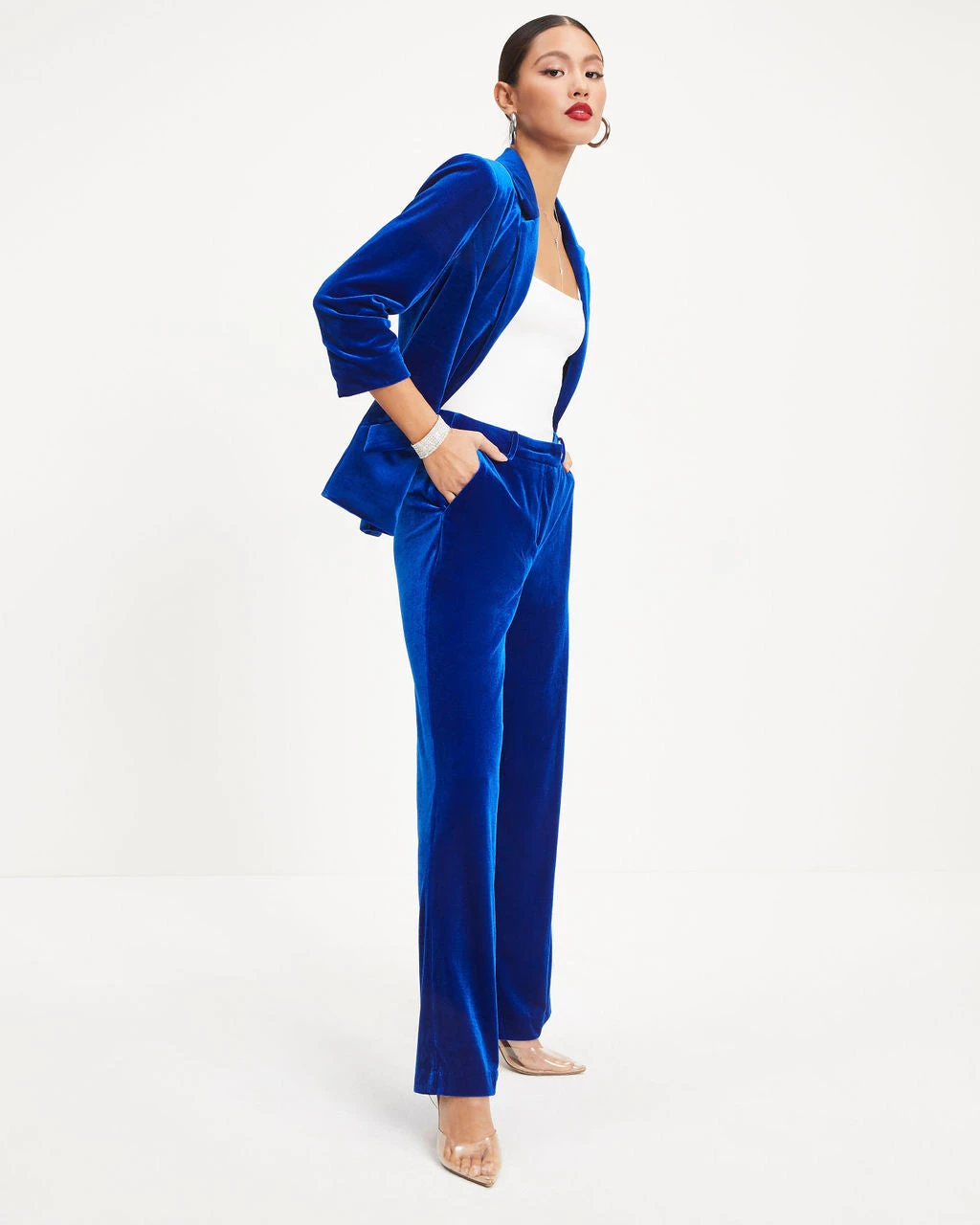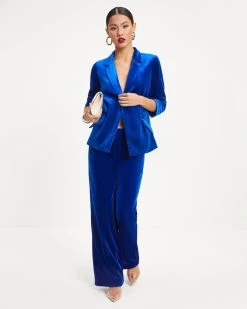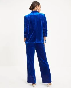 Professional meets festive in the Claudia Velvet Ruched Sleeve Blazer in cobalt that features padded shoulders.